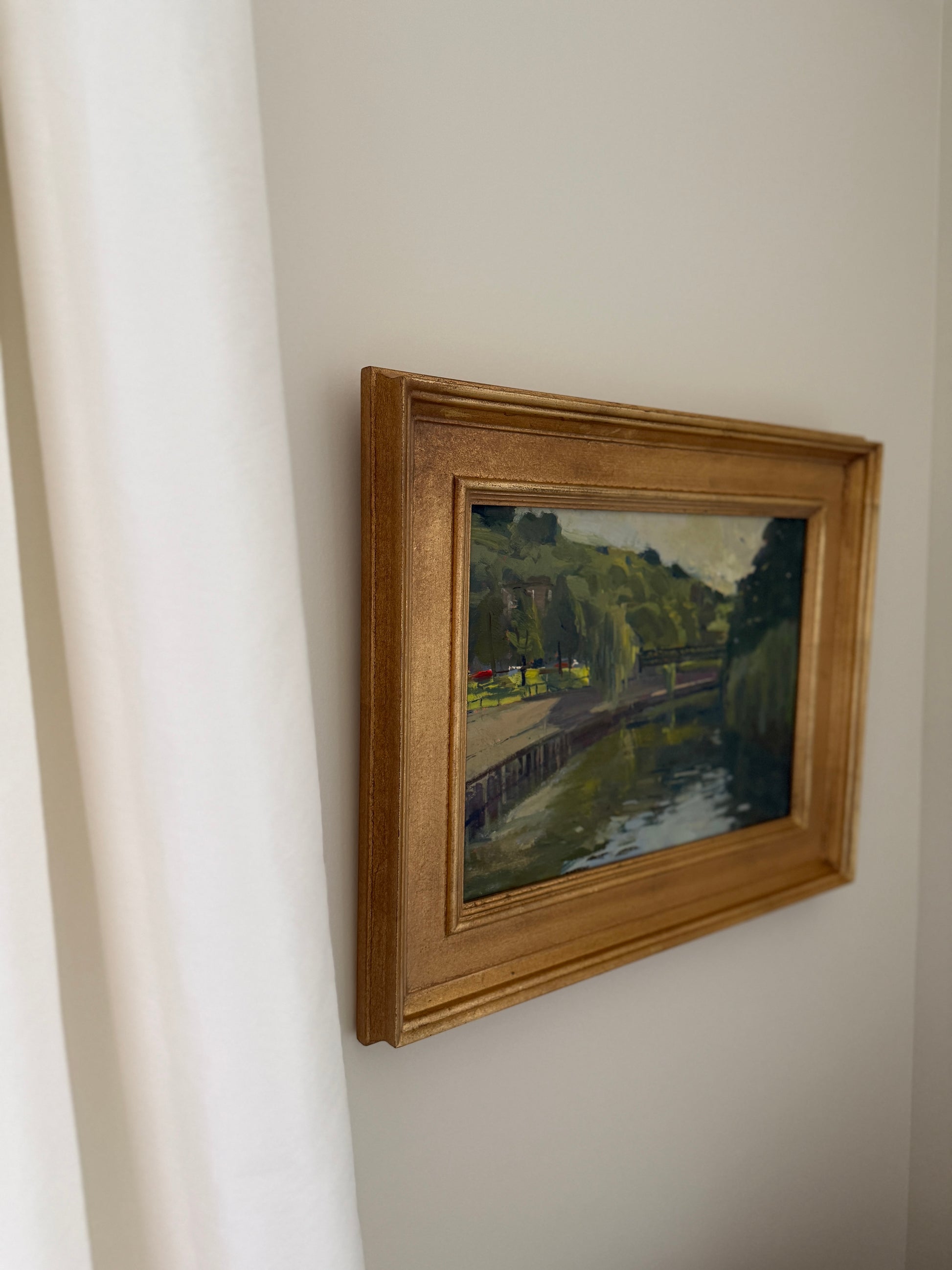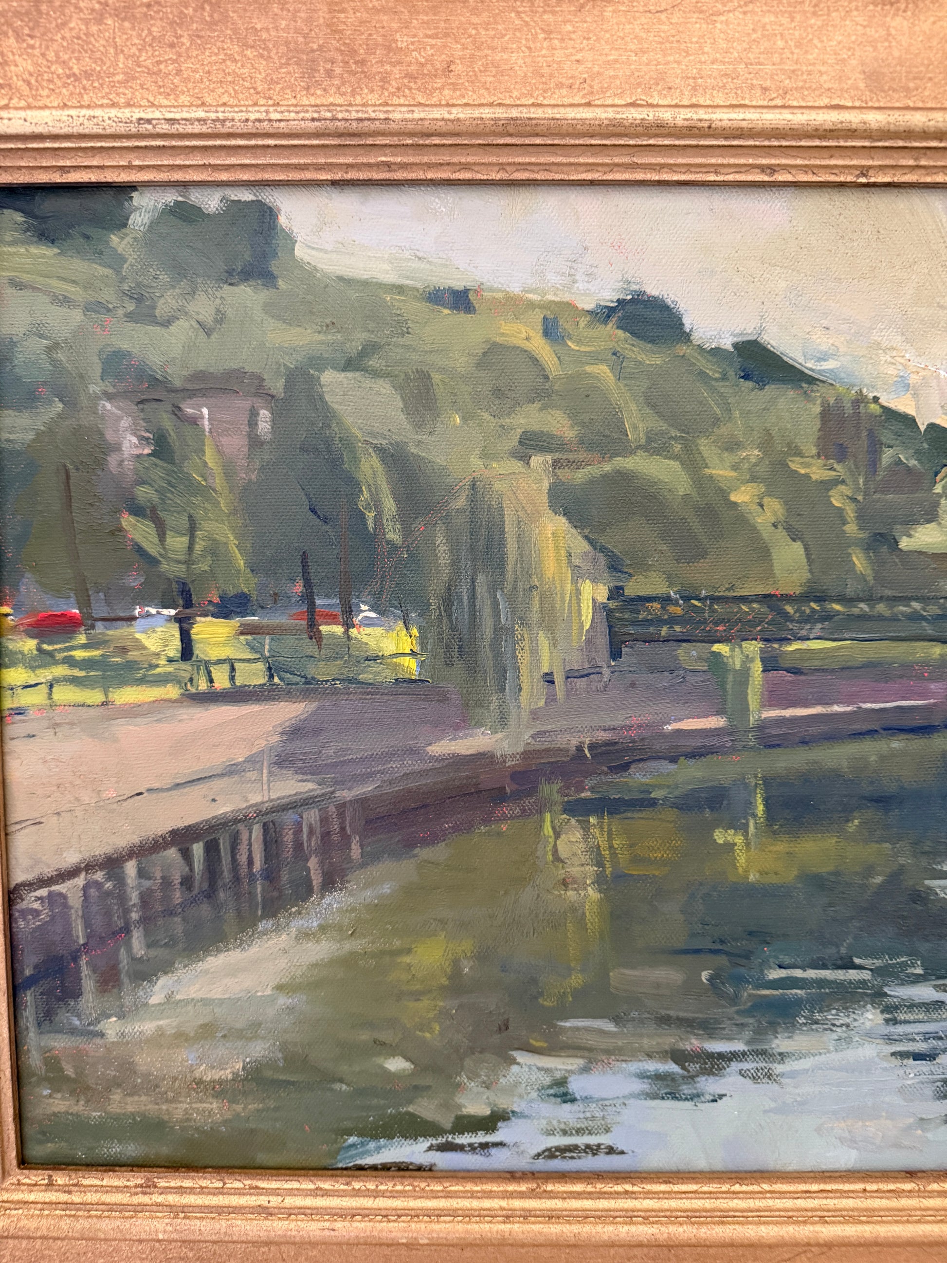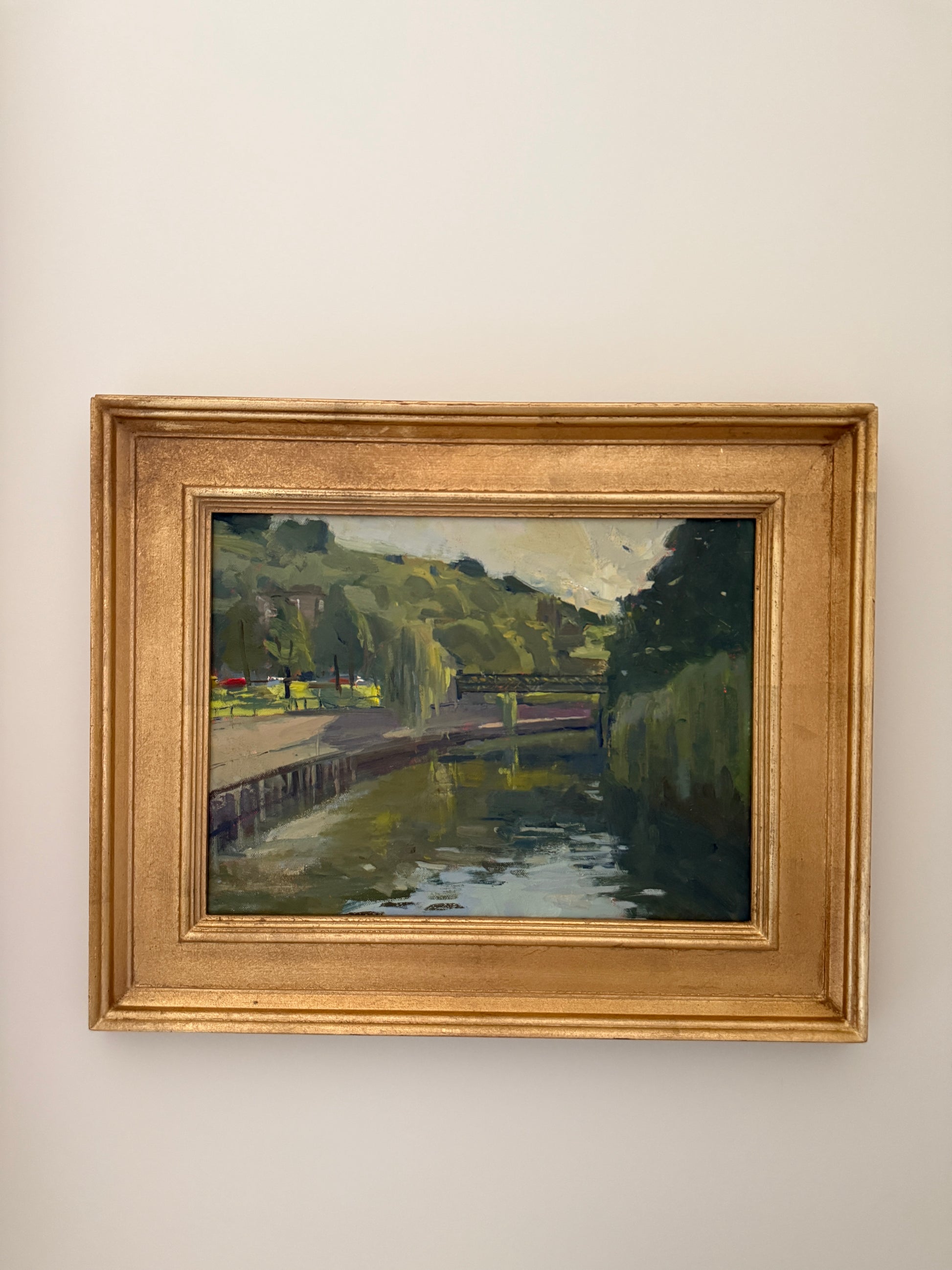 A fine impressionistic scene of Halfpenny bridge, crossing the River Avon in Bath. The artist has caught the view in a simple haze of green, with short directional brush strokes suggesting shadow and shape. Unsigned. The oil has been beautifully presented in a custom gilt effect frame with a label of biographical information verso. On canvas board. Approx 18x22”