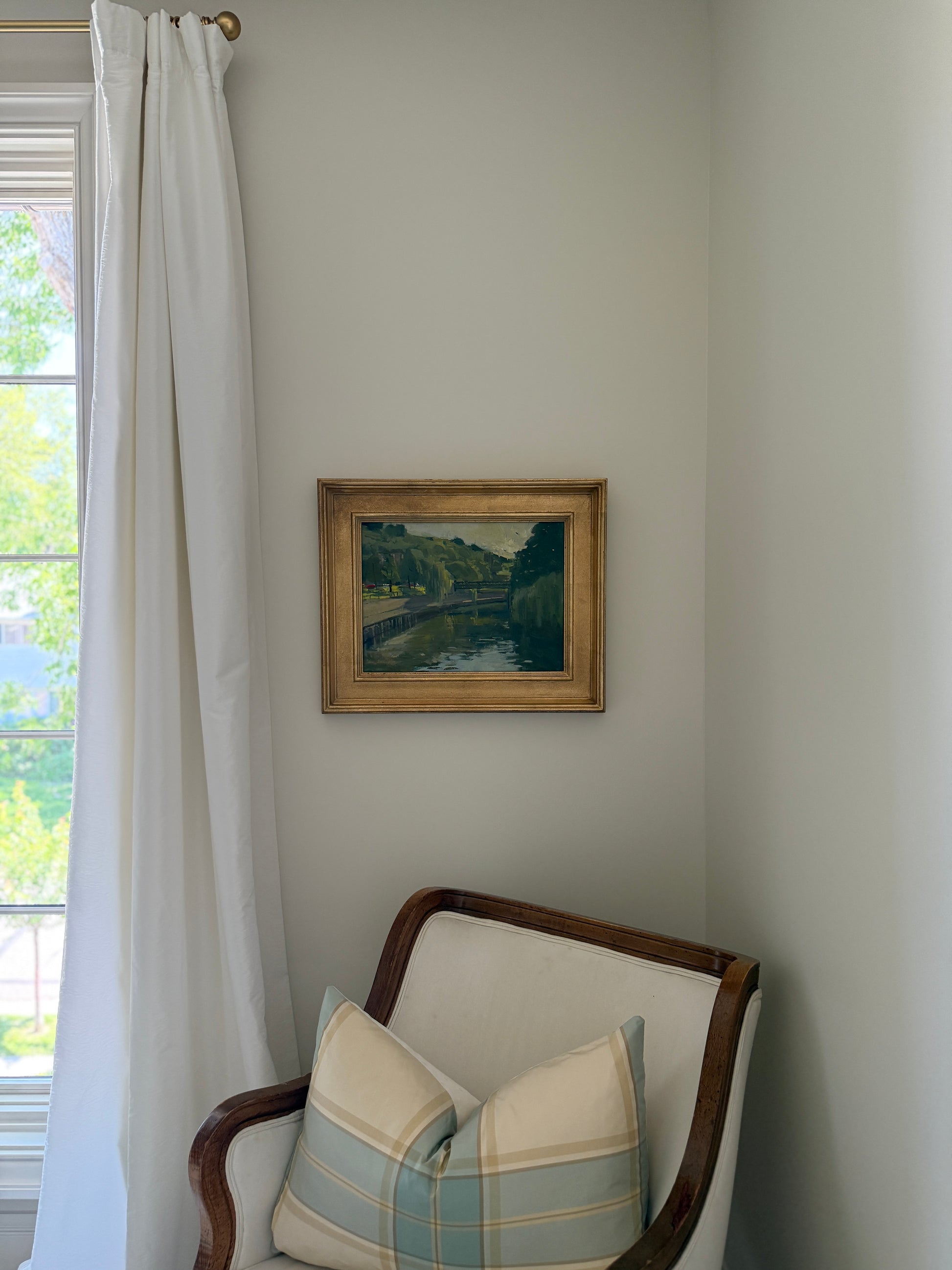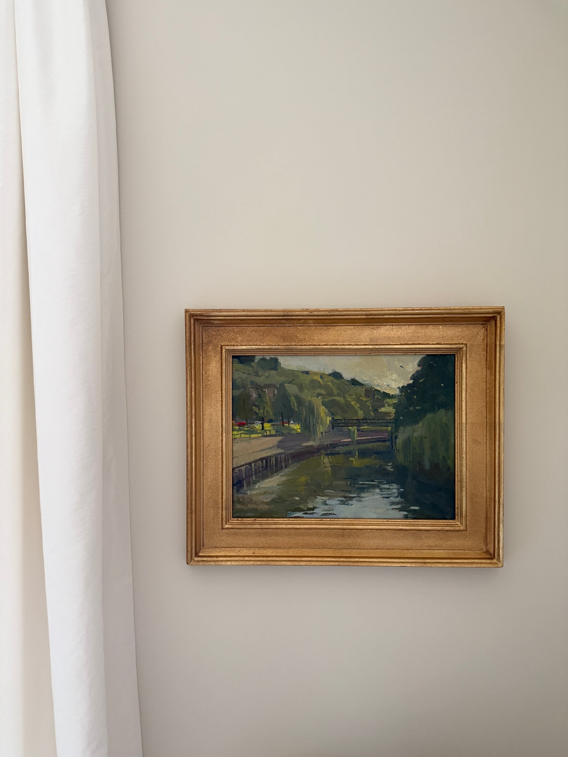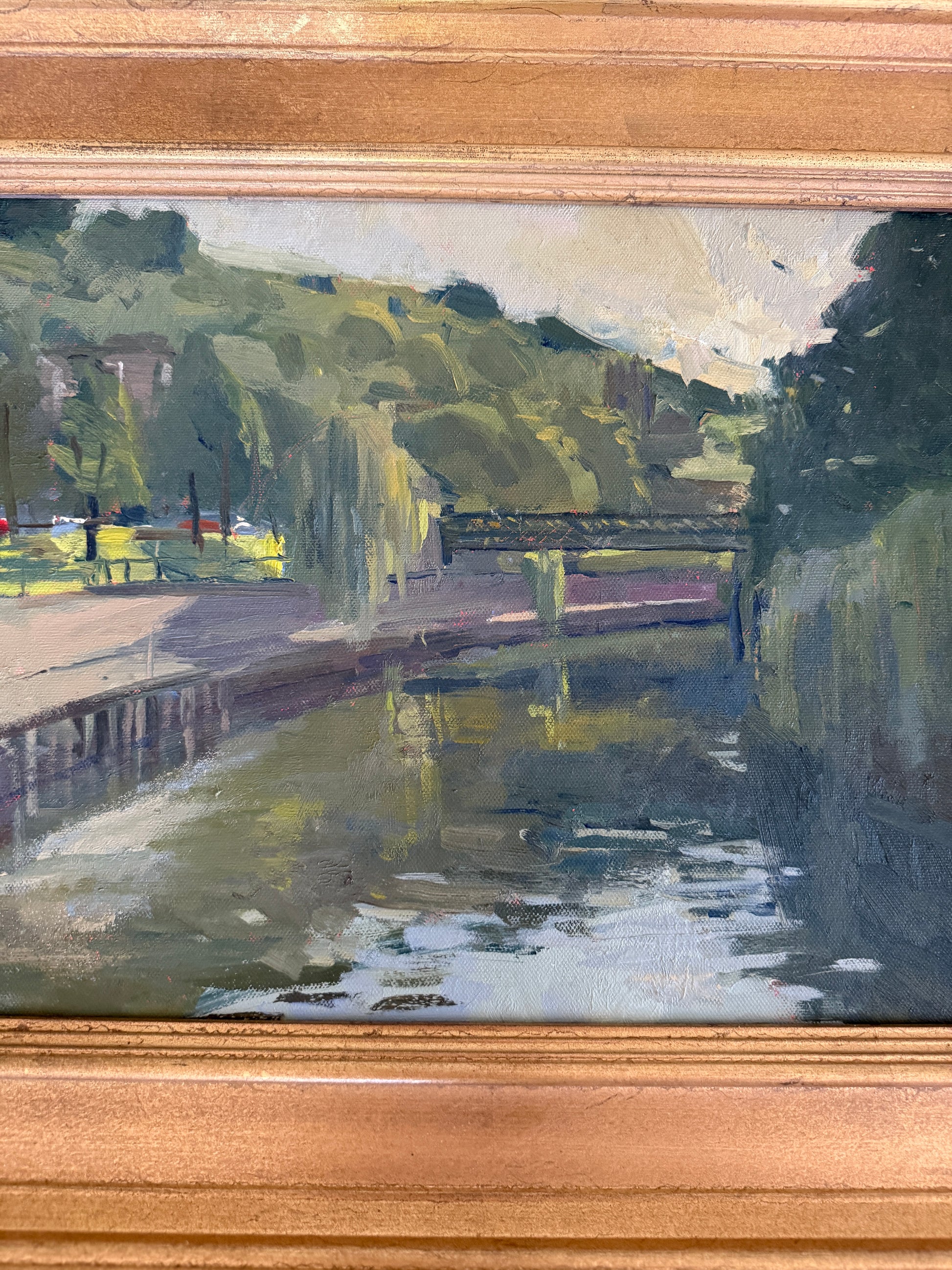 A fine impressionistic scene of Halfpenny bridge, crossing the River Avon in Bath. The artist has caught the view in a simple haze of green, with short directional brush strokes suggesting shadow and shape. Unsigned. The oil has been beautifully presented in a custom gilt effect frame with a label of biographical information verso. On canvas board. Approx 18x22”