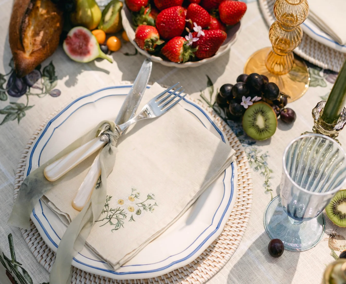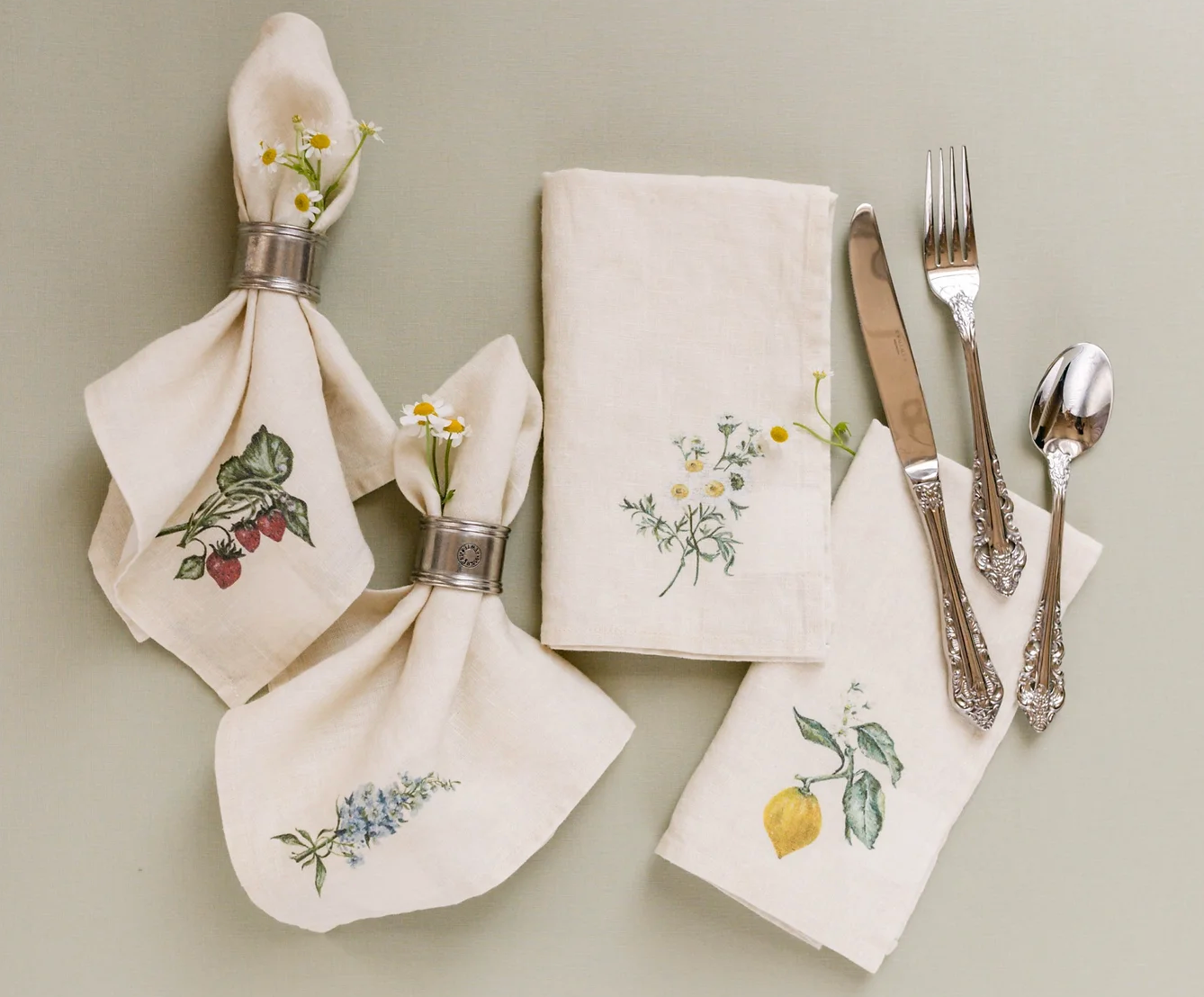 Message me to order more! Our vintage linen napkins add a charming touch to your summer table. Featuring images of our favourites, delphinium, strawberries, daisies and bergamot. Set of four napkins pairs lovely with the corresponding tablecloth. Enjoy together or separately! • 16x16” • 100% fine linen • Wash cold on delicate cycle & line dry • Qty: 4