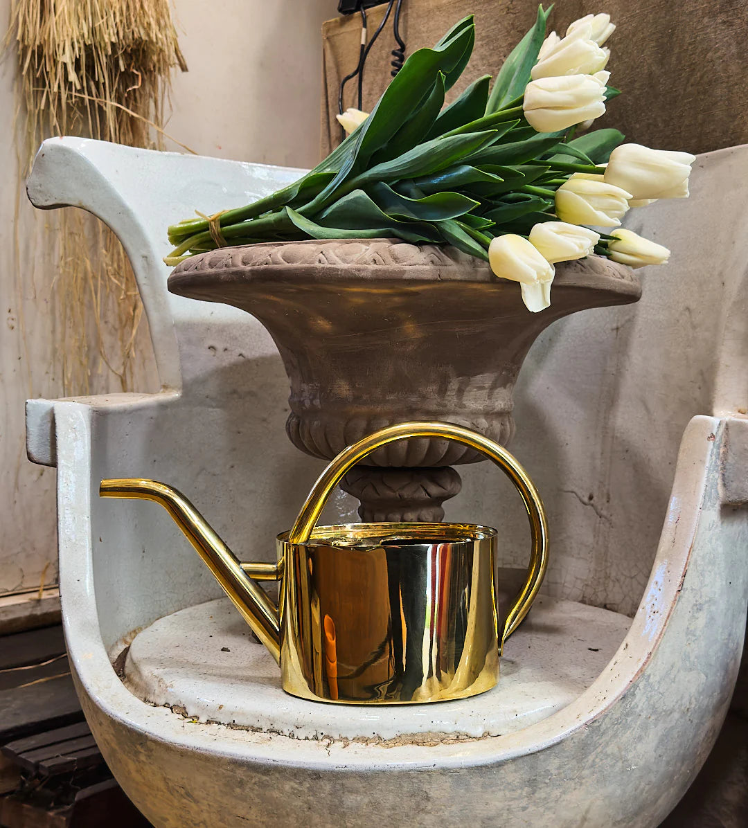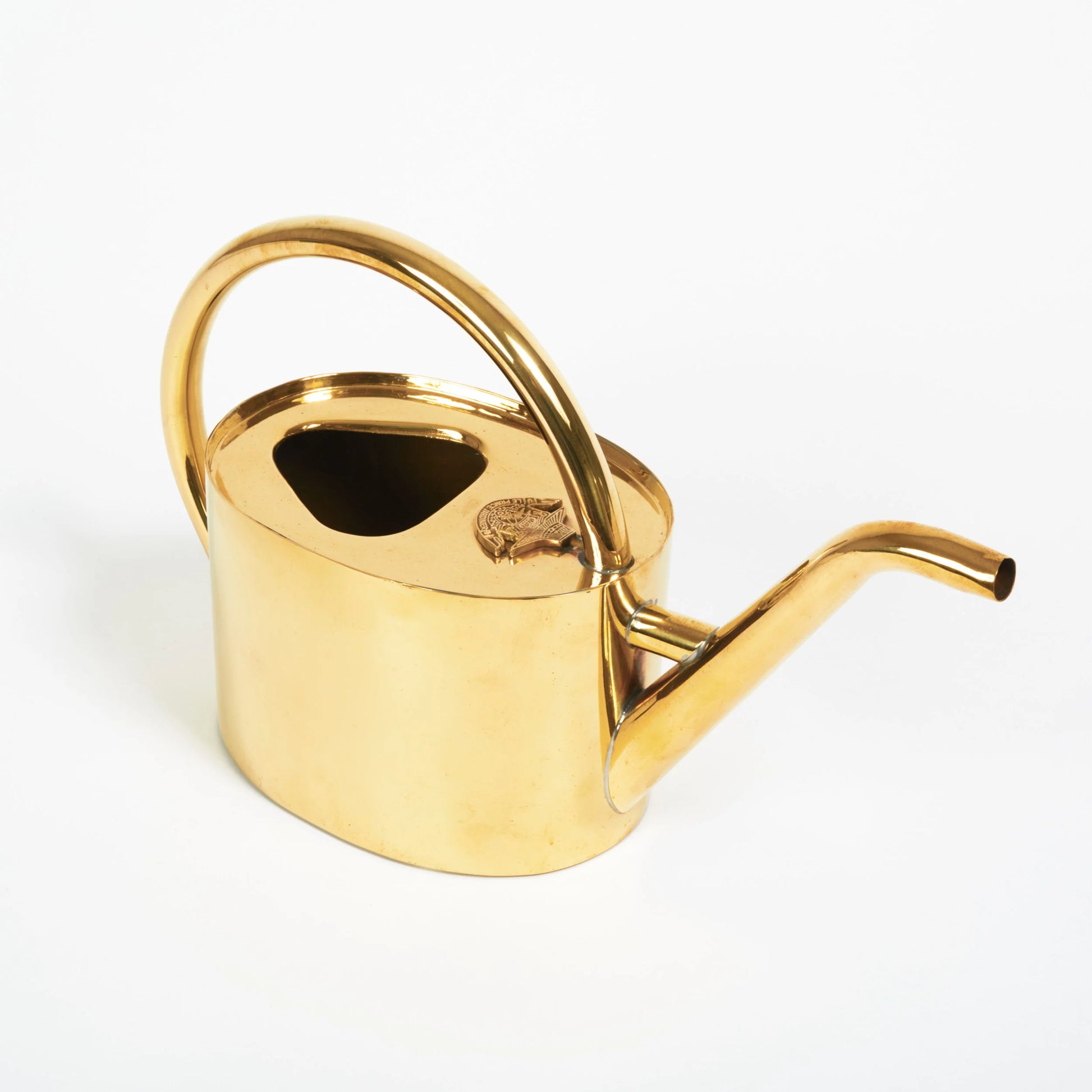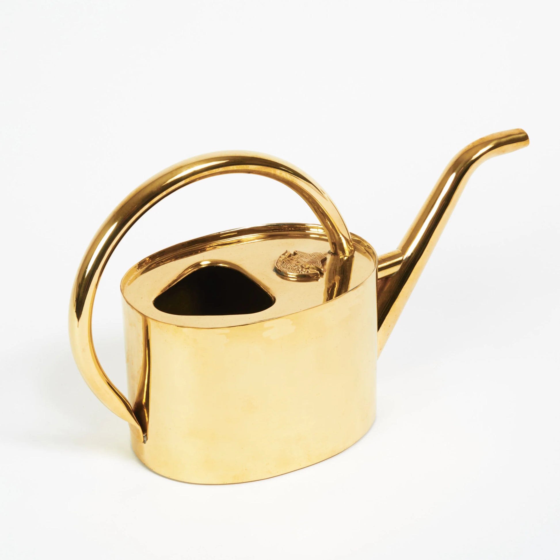 Watering can in gilded brass, stamped with the Le Prince Jardinier coat of arms. Its shape is original and its format is practical. Its fairly wide handle allows it to be held comfortably with one hand.