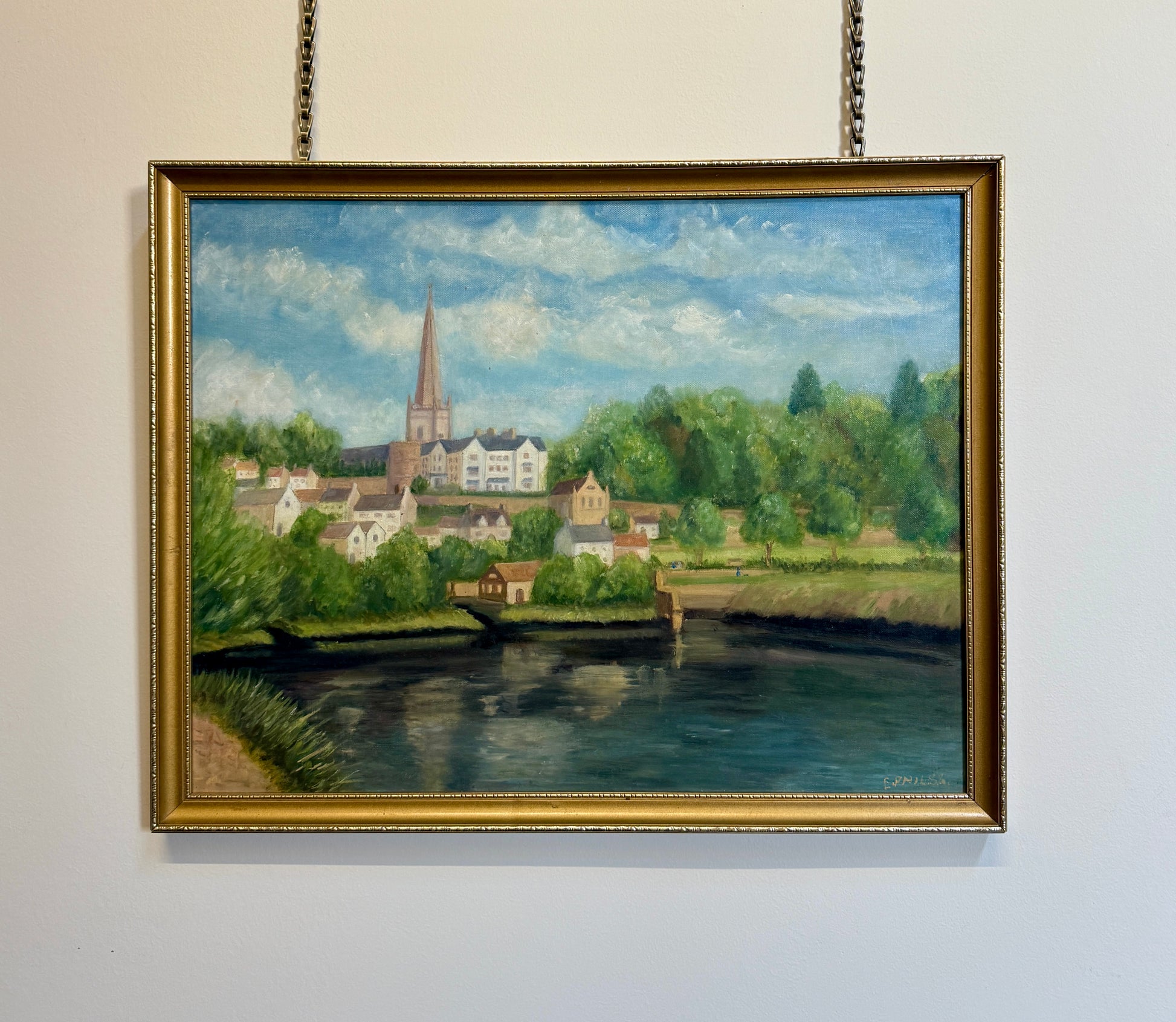 A summery landscape showing a view across the River Wye to the market town on Ross-On-Wye. The artist has signed illegibly and dated to the lower right corner and the painting has been presented in a contemporary gilt frame. On canvas board.