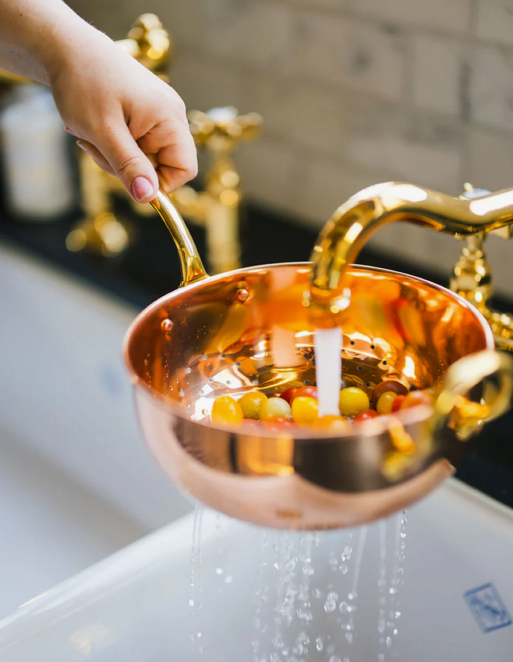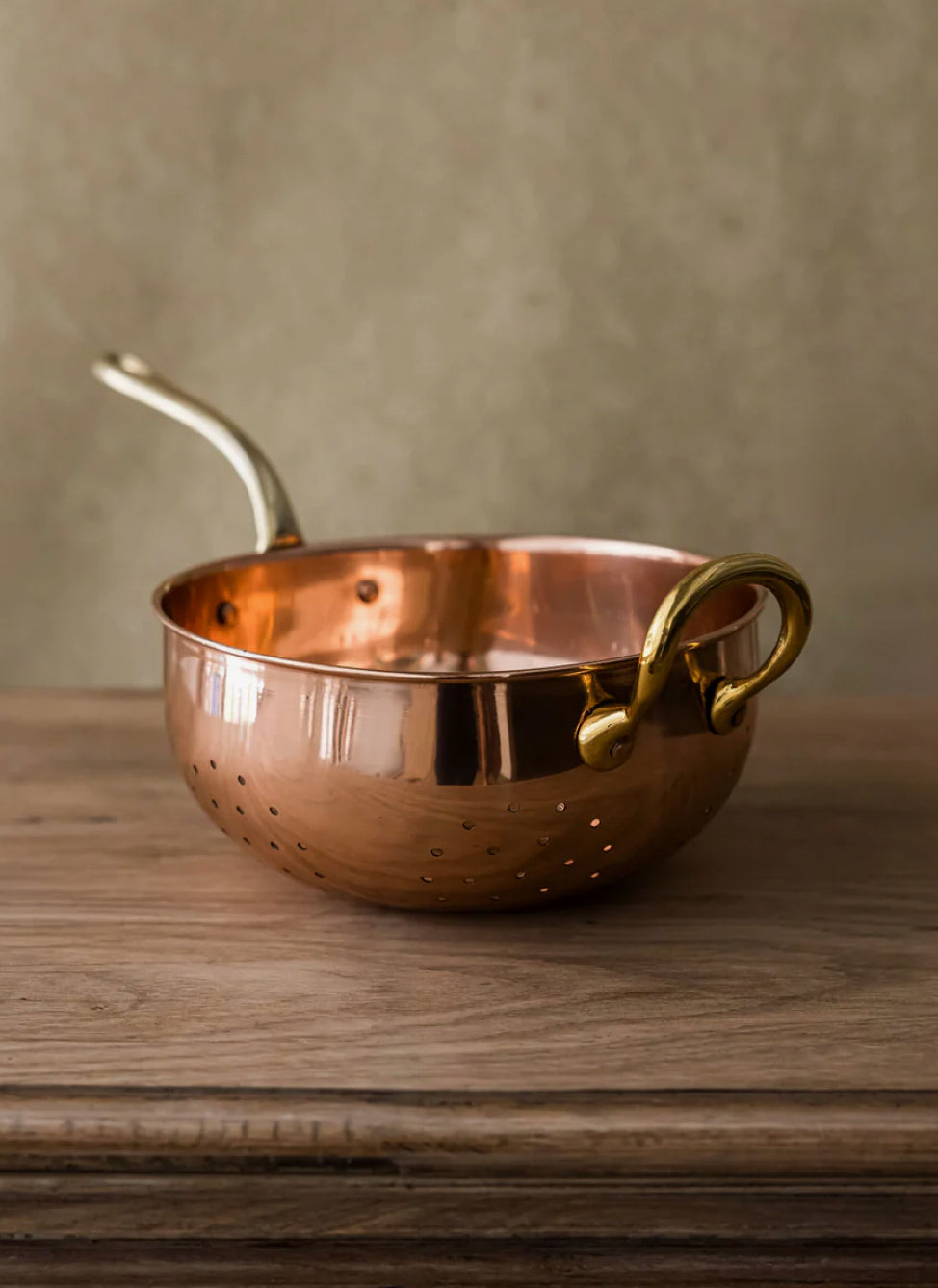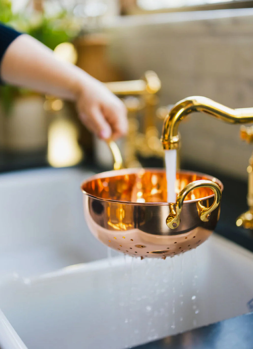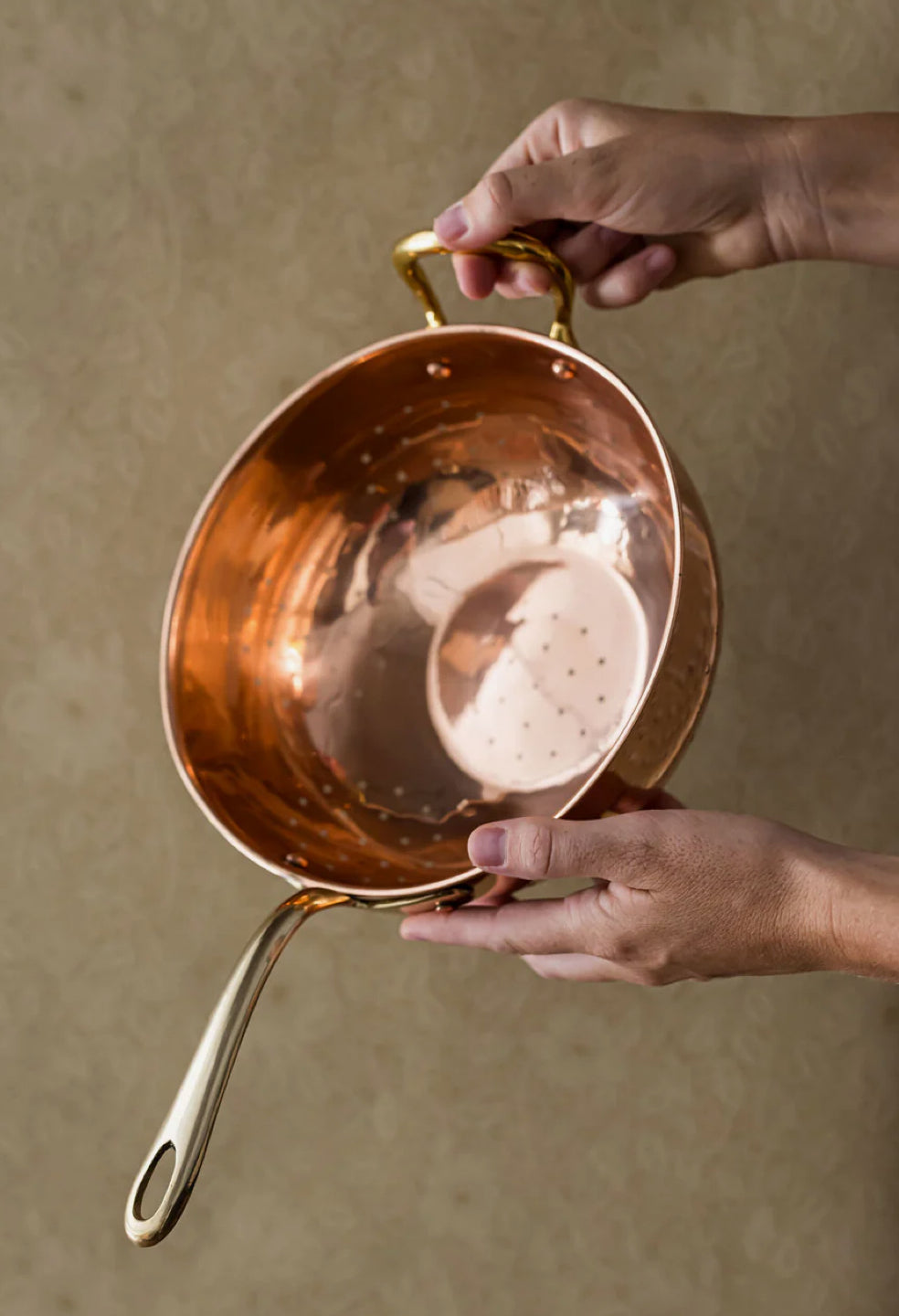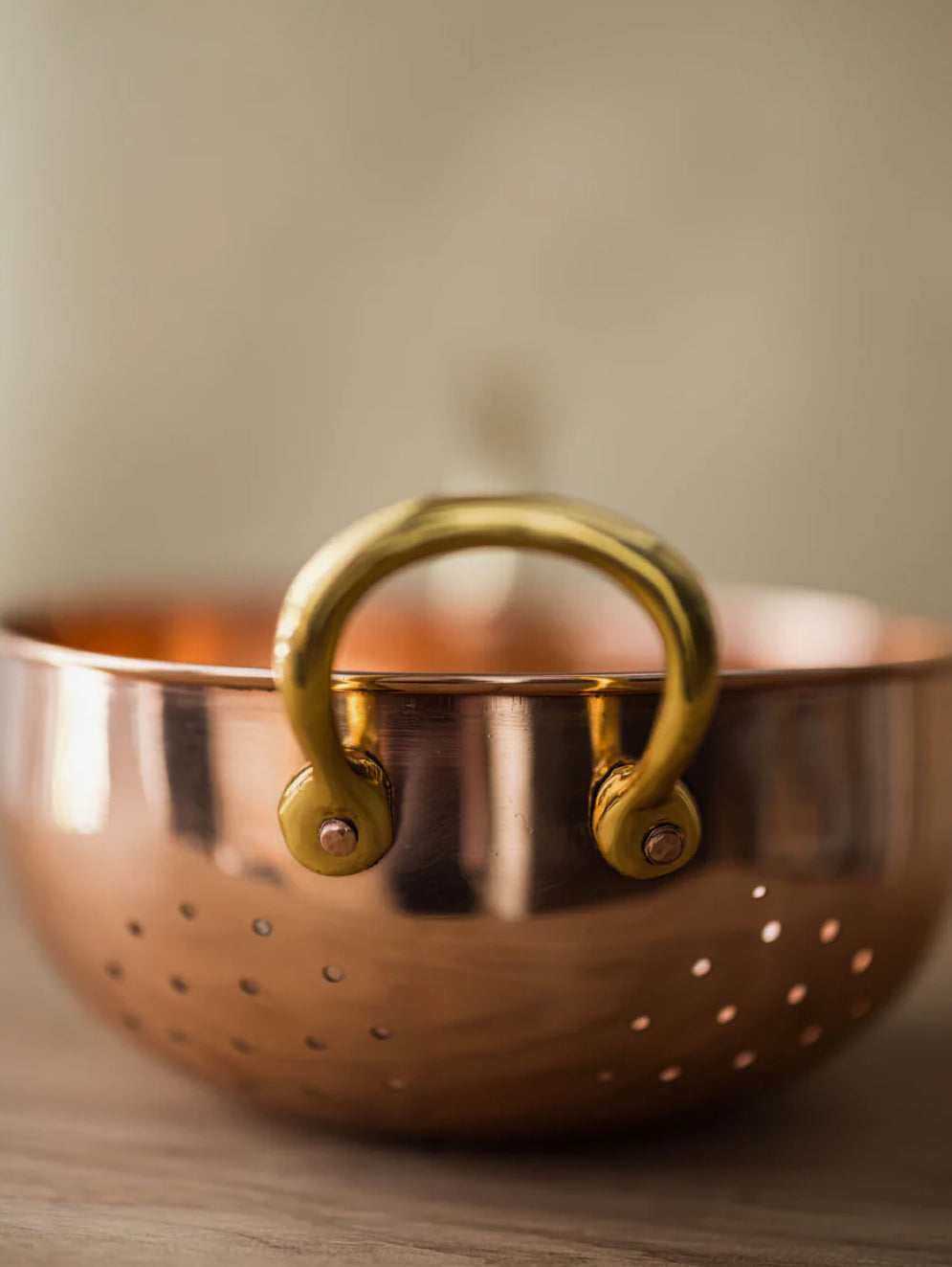 This beautifully handcrafted solid copper colander brings a touch of timeless elegance to your kitchen. Expertly crafted by skilled artisans, each piece features intricate detailing and a stunning, rich copper finish that will only deepen and improve with age. Perfect for draining pasta, washing vegetables, or straining fruit, its sturdy construction ensures durability while offering a lightweight feel for easy handling. The smooth, polished surface is easy to clean and resistant to corrosion, making it both functional and decorative.