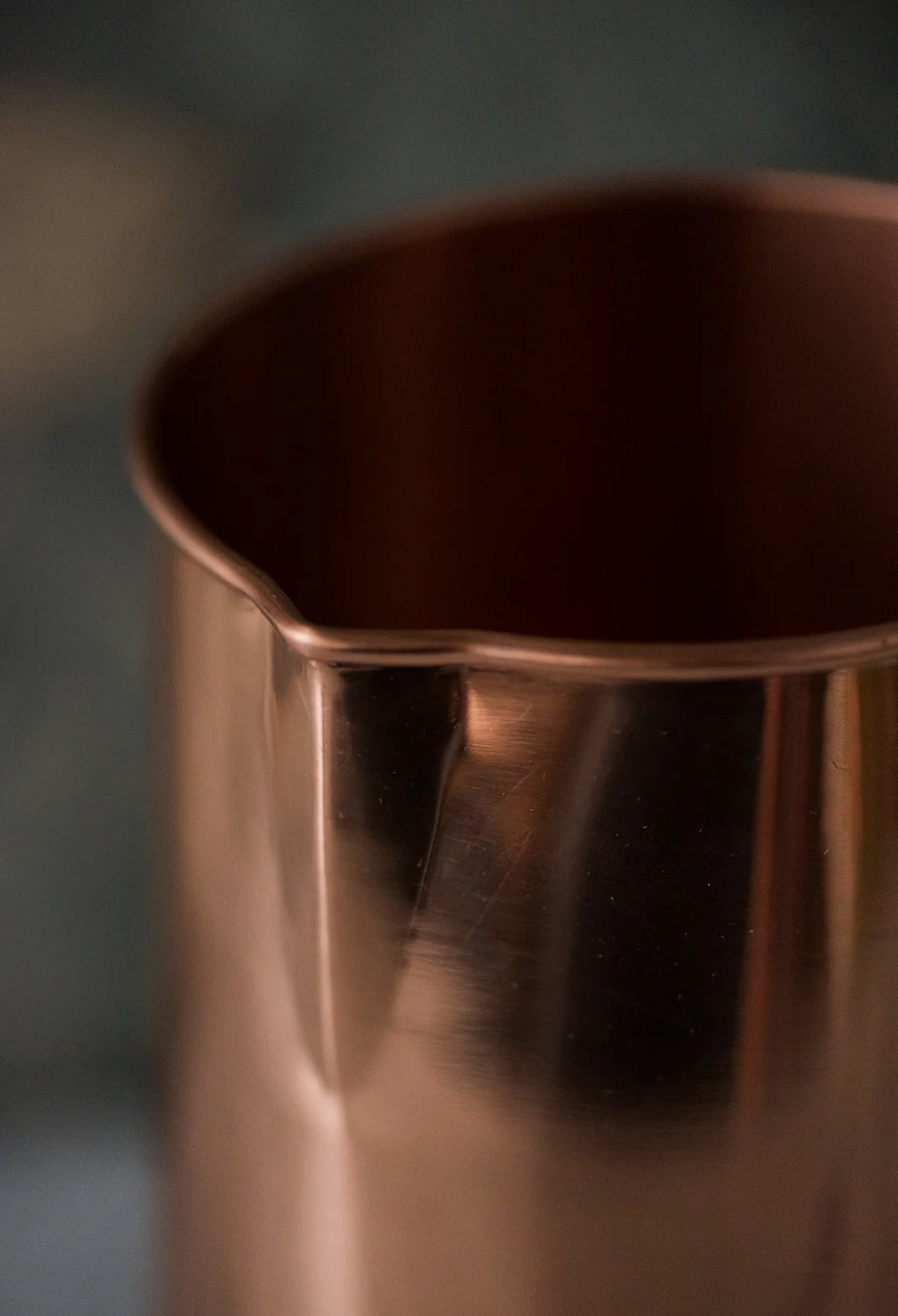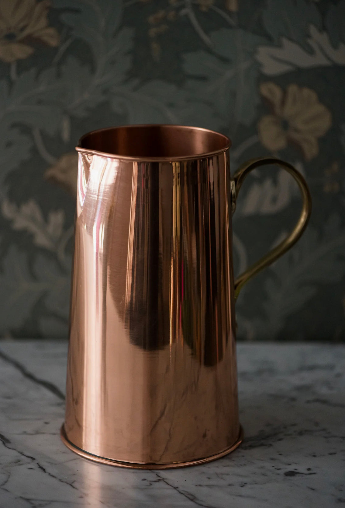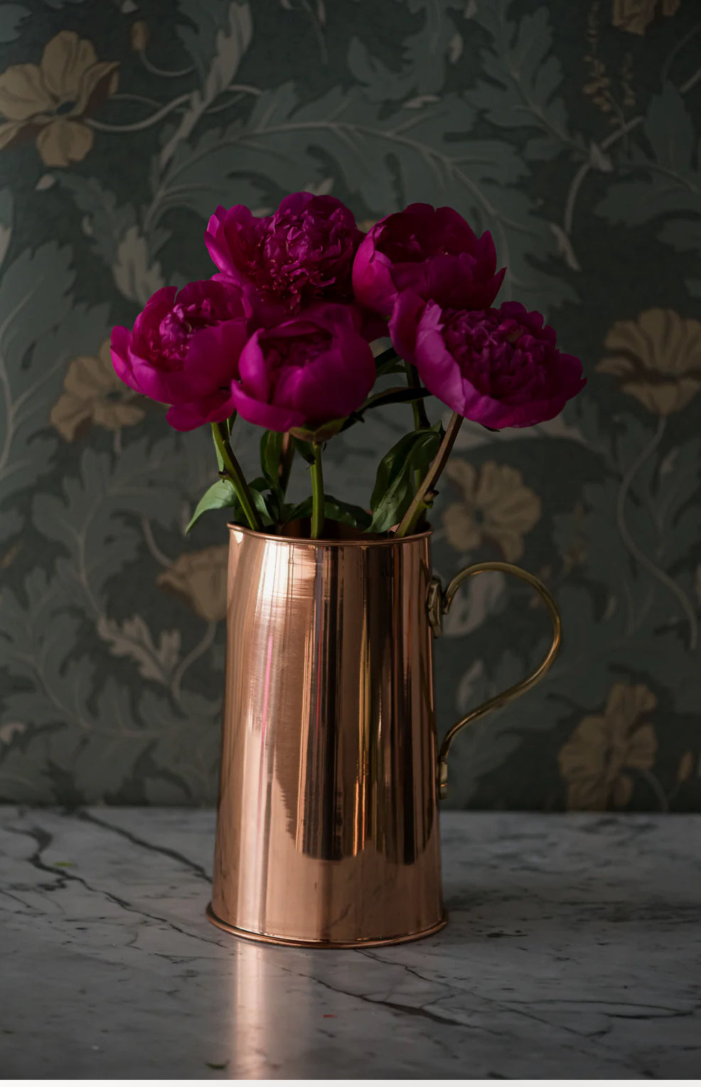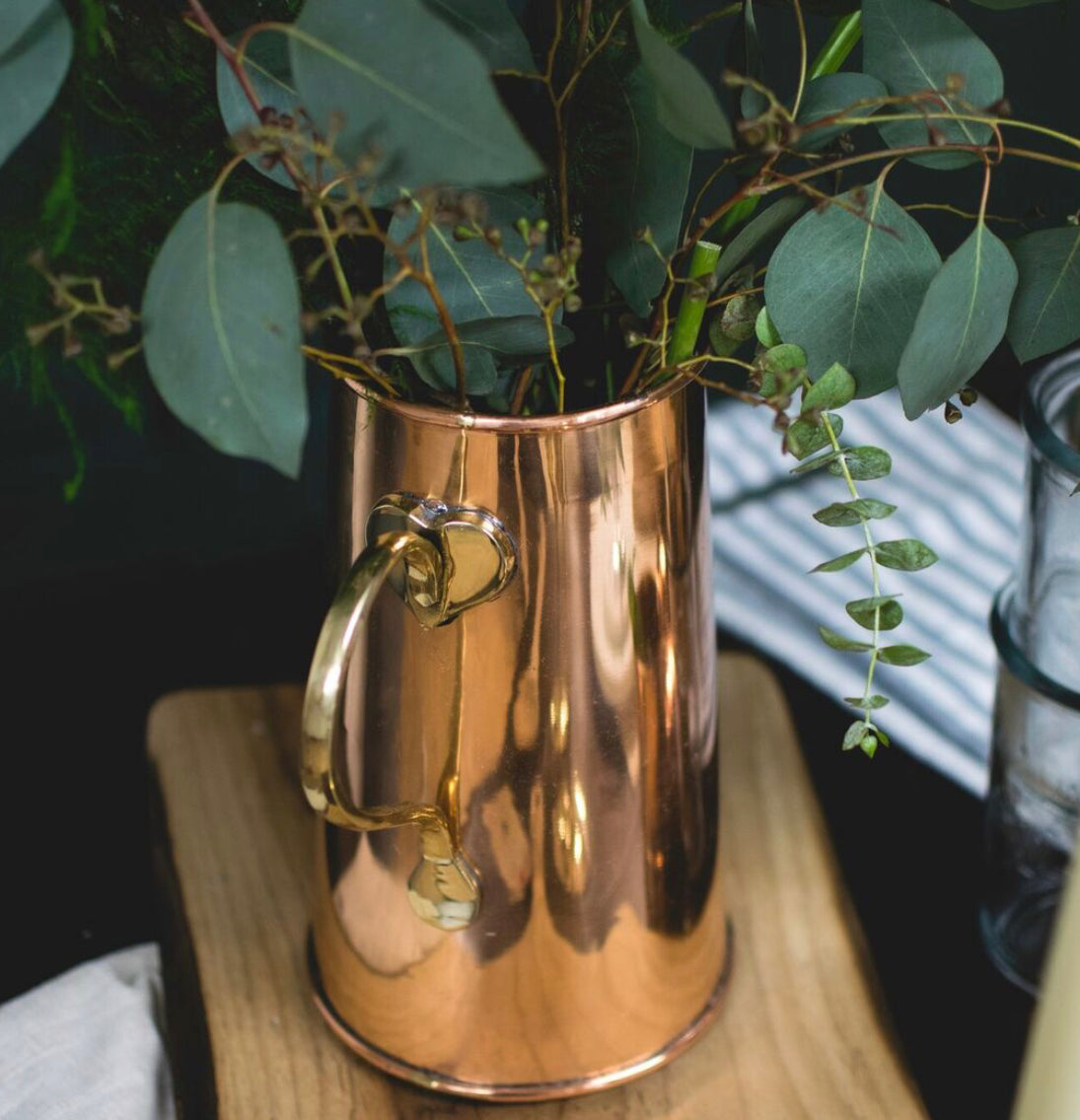 10” tall copper and brass pitcher. So beautiful on the table or used to display flowers. Love the heart shaped brass handle detail.
