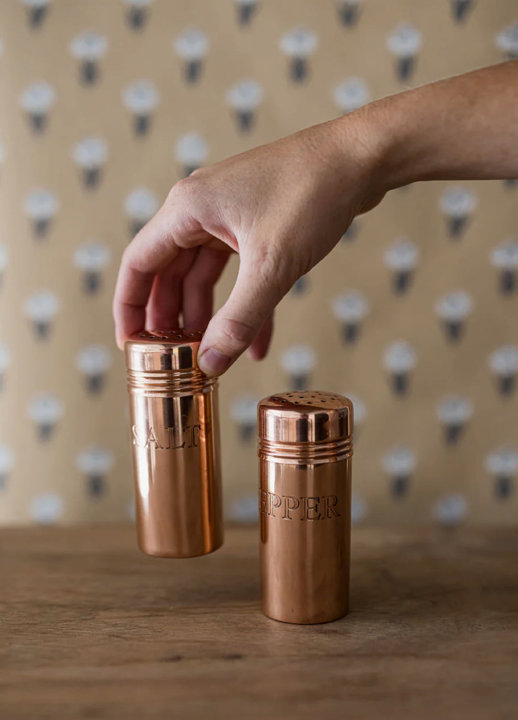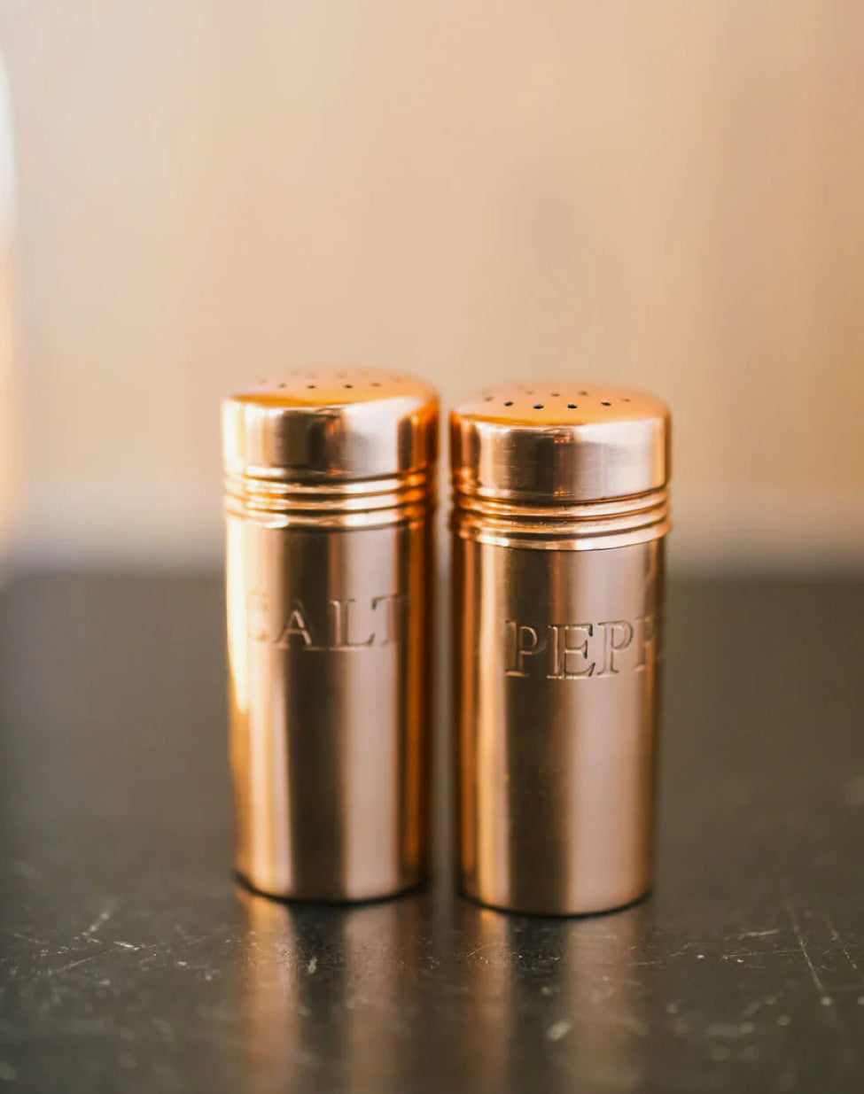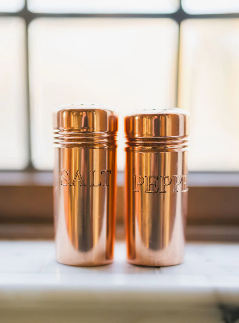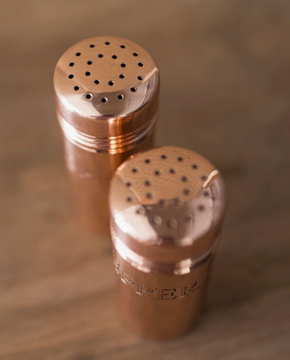 Made from high-quality, durable copper, each shaker is expertly hand-formed by skilled artisans, ensuring a unique and timeless piece for your kitchen. The warm, glowing hue of the copper ages beautifully over time, developing a rich patina that enhances its charm. The shakers are designed in house with easy dispensing and a sleek, minimalist shape that complements any table setting. Perfect for everyday use or as a thoughtful gift, these copper salt and pepper shakers are a functional and stylish addition to your home.