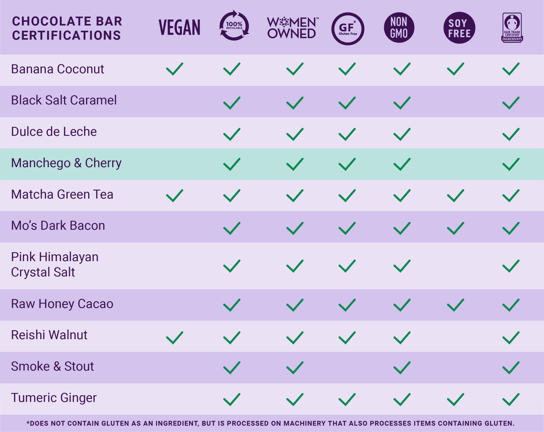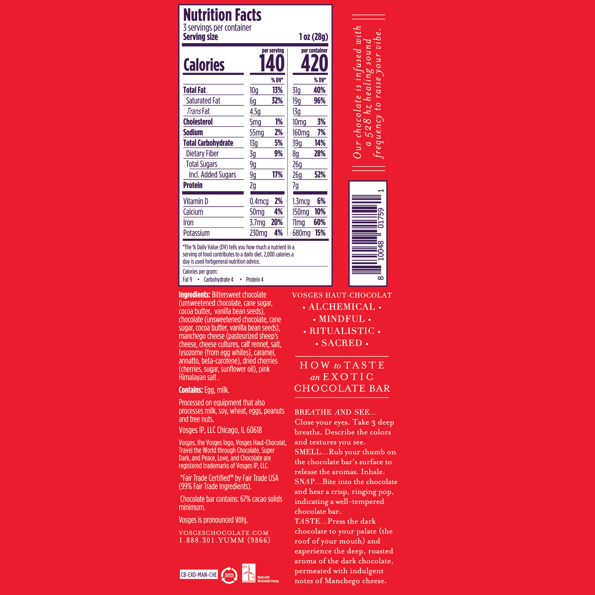 Ross’s personal favorite chocolate bar. Experience a delightful fusion of flavors with our 67% Cacao Dark Chocolate Bar featuring Manchego Cheese and Cherry. Crafted with care and precision, this unique chocolate bar brings together the rich depth of 67% dark chocolate with the distinctive tanginess of D.O.P. 12-month aged Manchego cheese. Indulge in the sweet and tart flavors of dried Montmorency cherries, perfectly complementing the creamy richness of the Manchego cheese. Each bite offers a harmonious balance of savory and sweet notes, creating a truly memorable taste experience. Handcrafted in small batches, our gourmet chocolate bar is a testament to the art of chocolate making. Whether you enjoy it as a luxurious treat for yourself or share it with loved ones, our Manchego Cheese and Cherry Bar is sure to captivate the palate of even the most discerning chocolate enthusiasts.