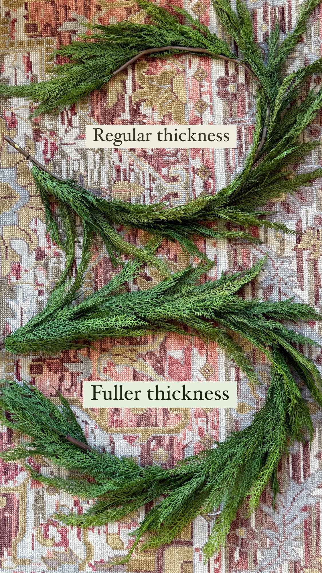 This very realistic faux cedar garland is one of my staples for holiday decor….and faux is NOT all the same. This is the most realistic traditional cedar I have found for the best price and will be used for many years to come. This year I have the regular thickness or the fuller thickness. They are exactly the same otherwise. When decorating my banister I use two of the fuller size or 3 of the regular size cedar and one eucalyptus for every 5.5 foot swag. Add ribbon and bells at each connection point and you will be feeling so festive at home! See my other listings for eucalyptus, bells and ribbons.