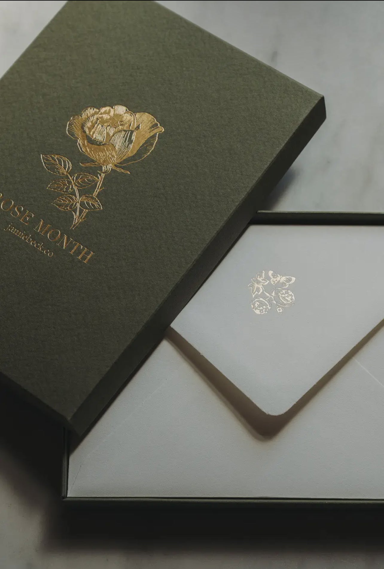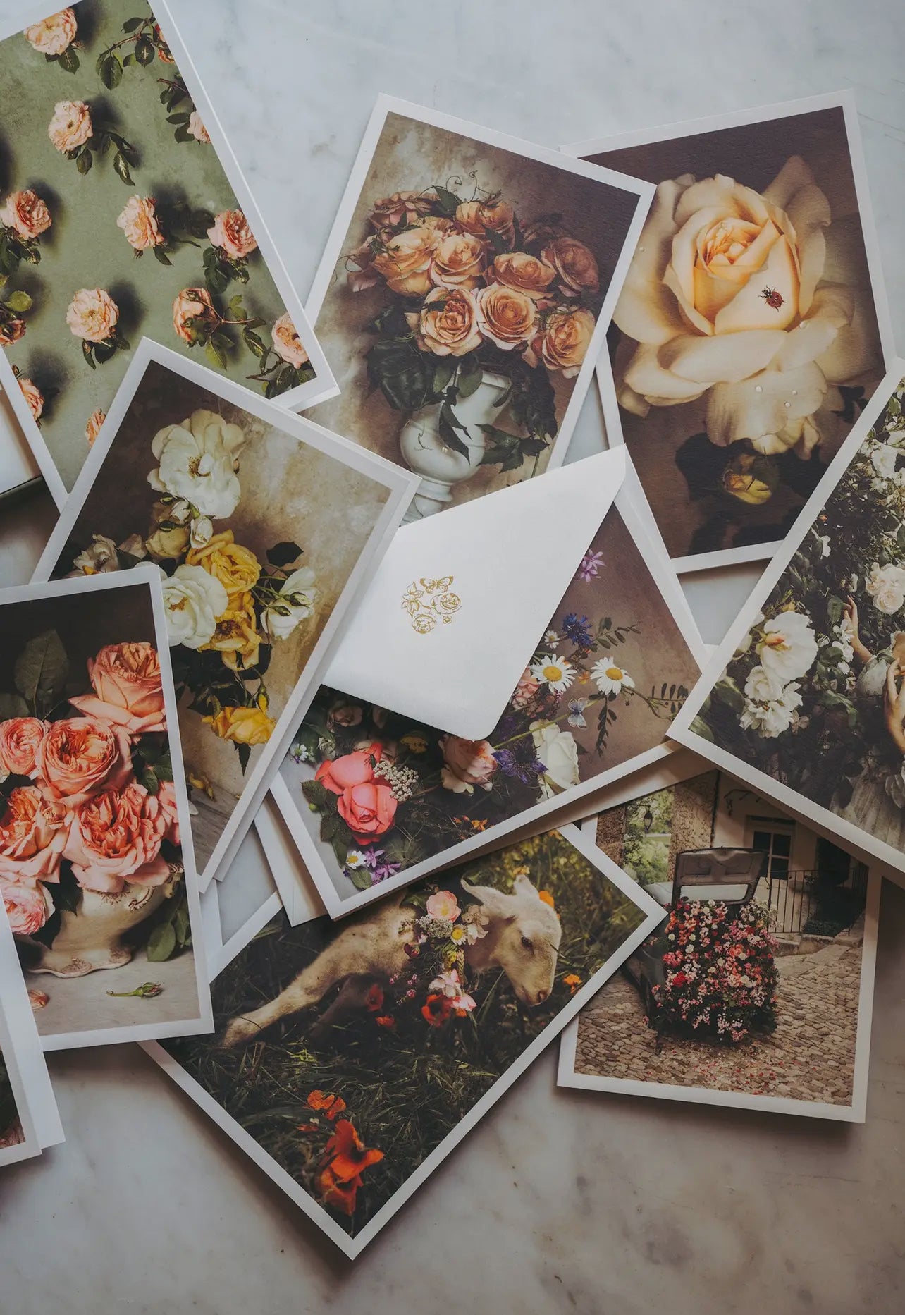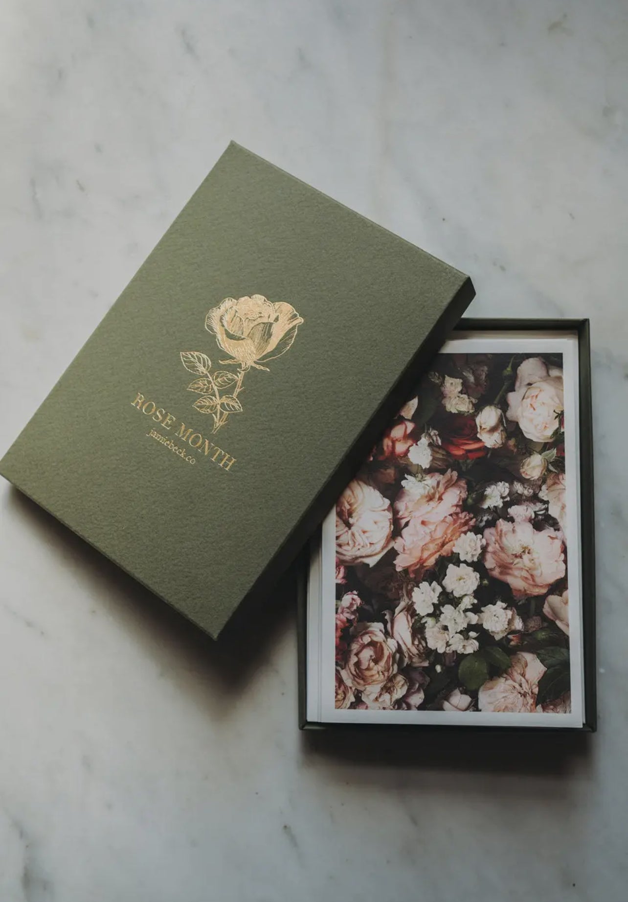 A selection of ten images from Jamie Beck's celebration of Rose de Mai, in elegant artisan folded cards, hand printed in France by L'atelier du Bibloquet. Each set includes thick, gold printed envelopes featuring details of our Rose Month logo packed inside a craftsman box. Perfect for saving notes or treasures from afar.