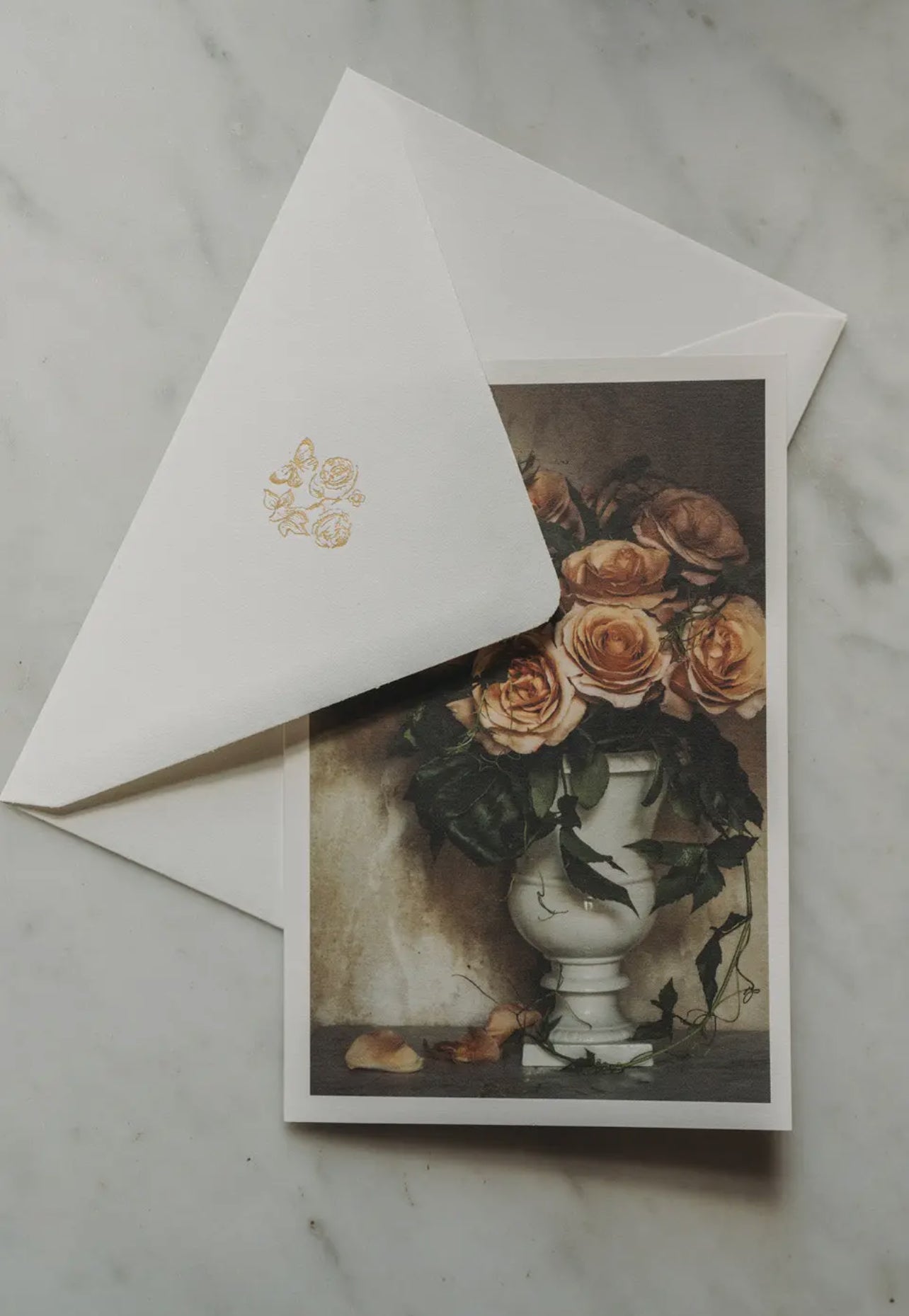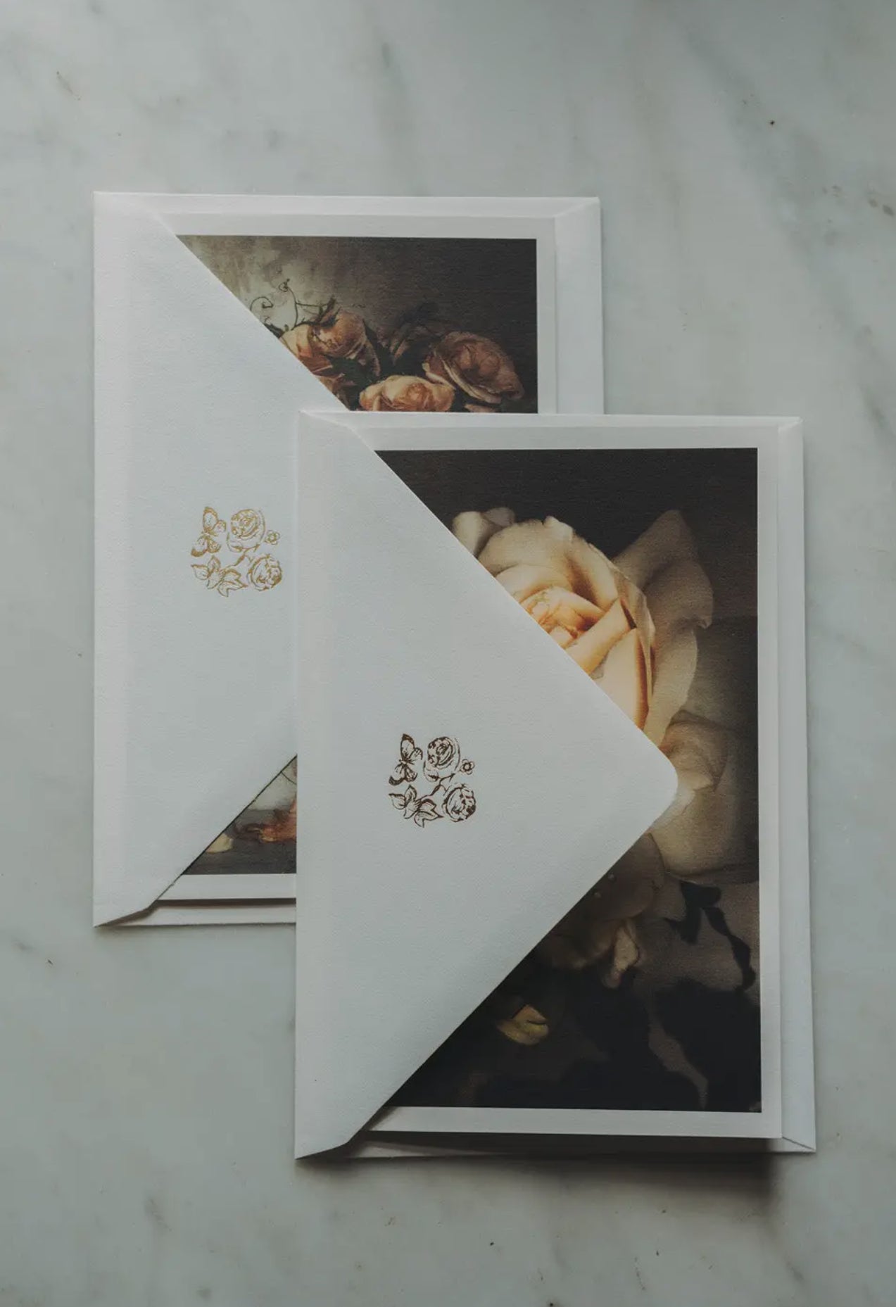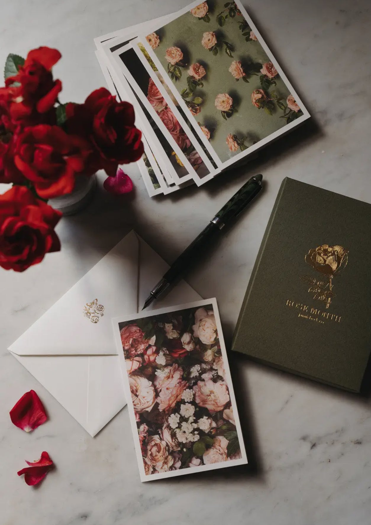 A selection of ten images from Jamie Beck's celebration of Rose de Mai, in elegant artisan folded cards, hand printed in France by L'atelier du Bibloquet. Each set includes thick, gold printed envelopes featuring details of our Rose Month logo packed inside a craftsman box. Perfect for saving notes or treasures from afar.