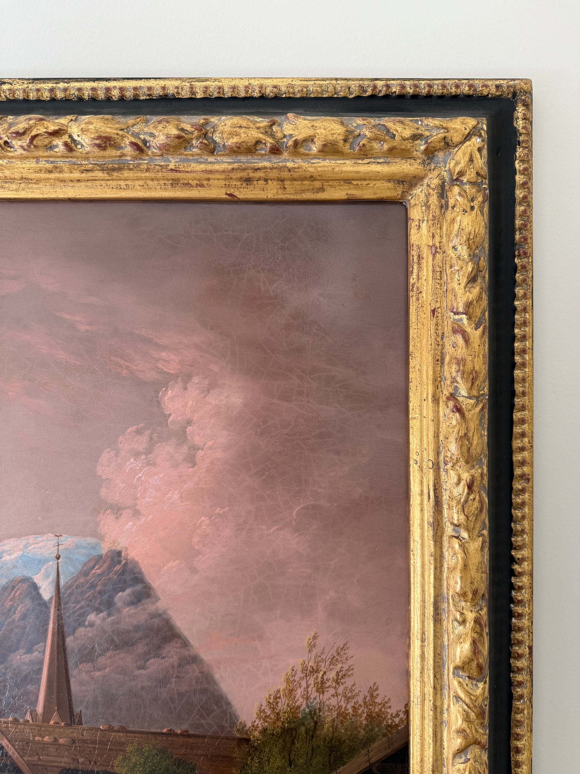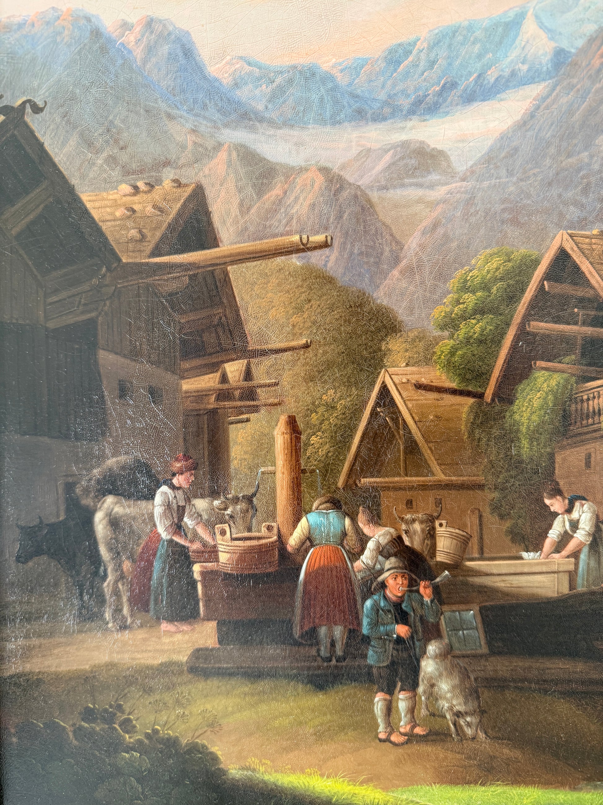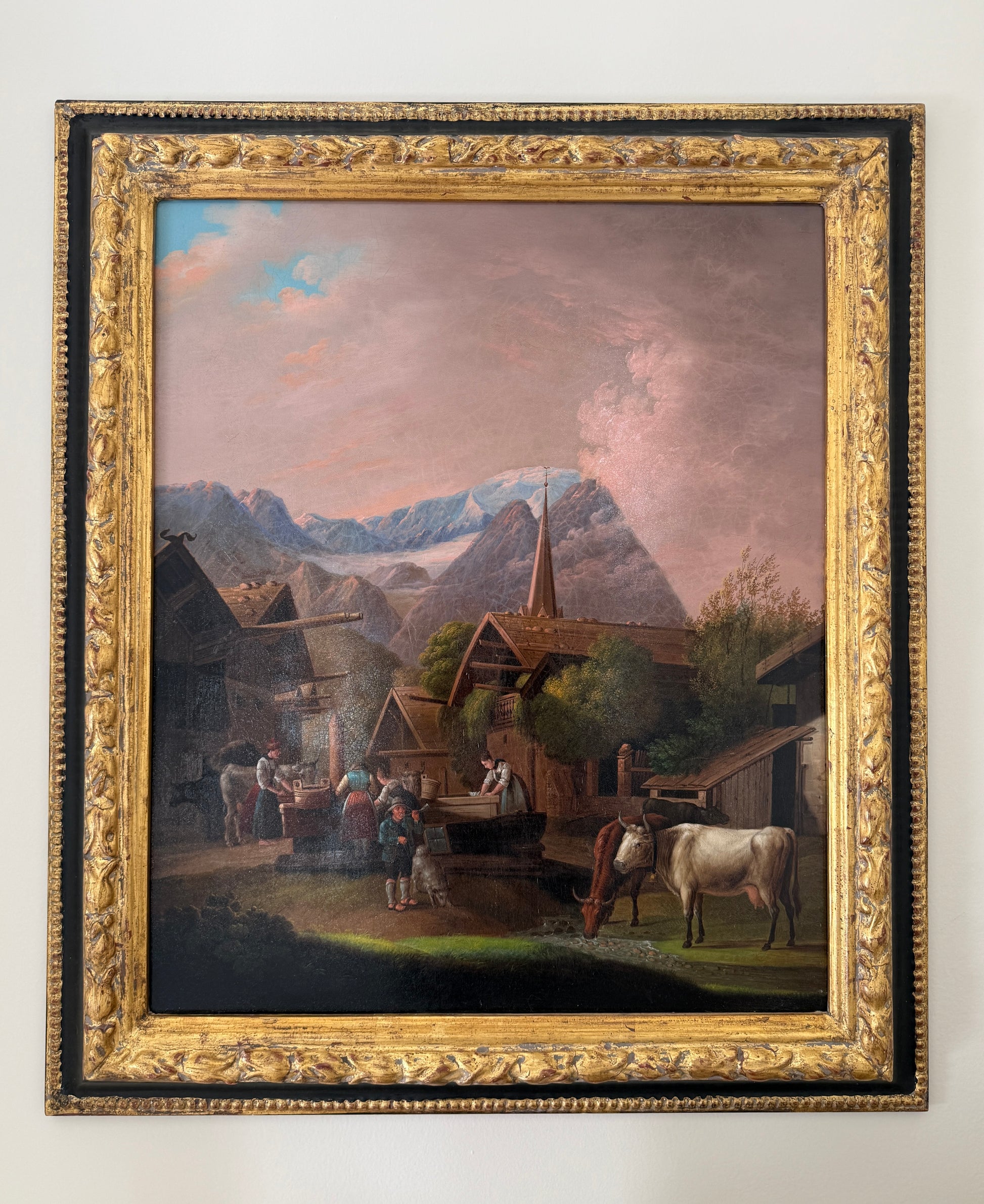 A wonderful original 19th century oil painting copy of Peter von Hess's 'Morning in Partenkirchen'. This romantic scene depicts neighbors at the foot of Germany's highest mountain, the Zugspitze. The oil does justice to the breathtaking views and Bavaria charm of this idyllic location. Beautifully housed in a gilt and ebony frame with bead-course and tulip mouldings. Unsigned. On canvas laid to board