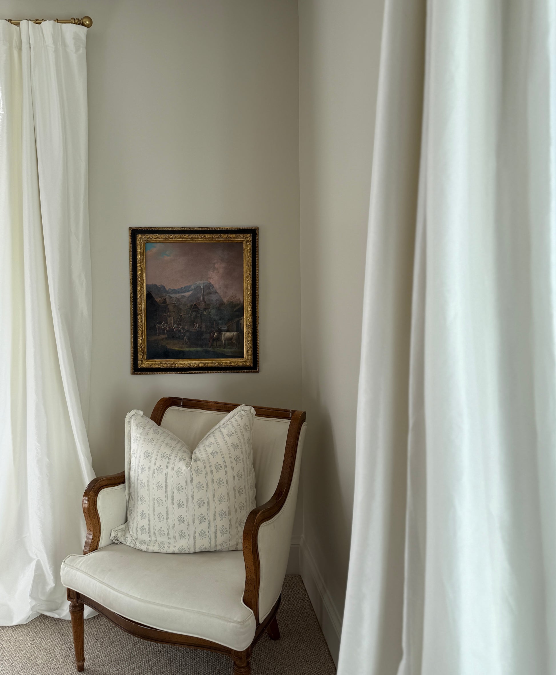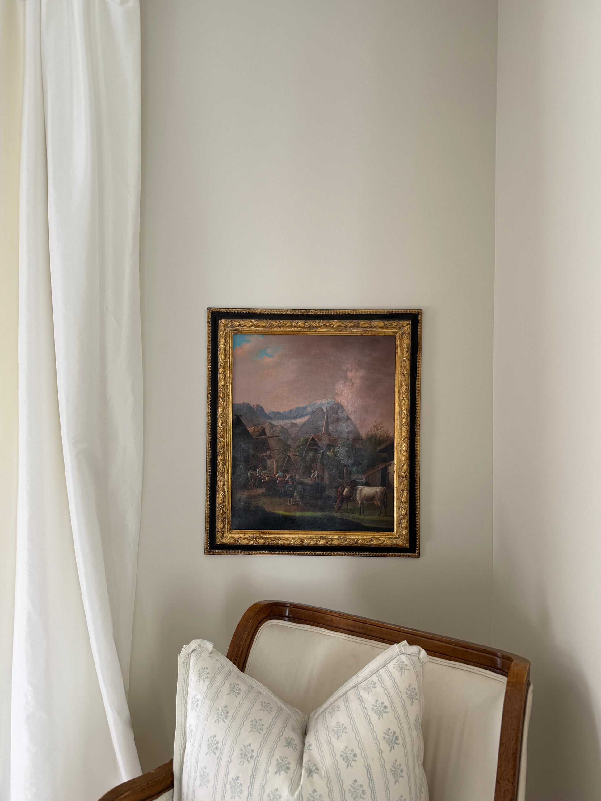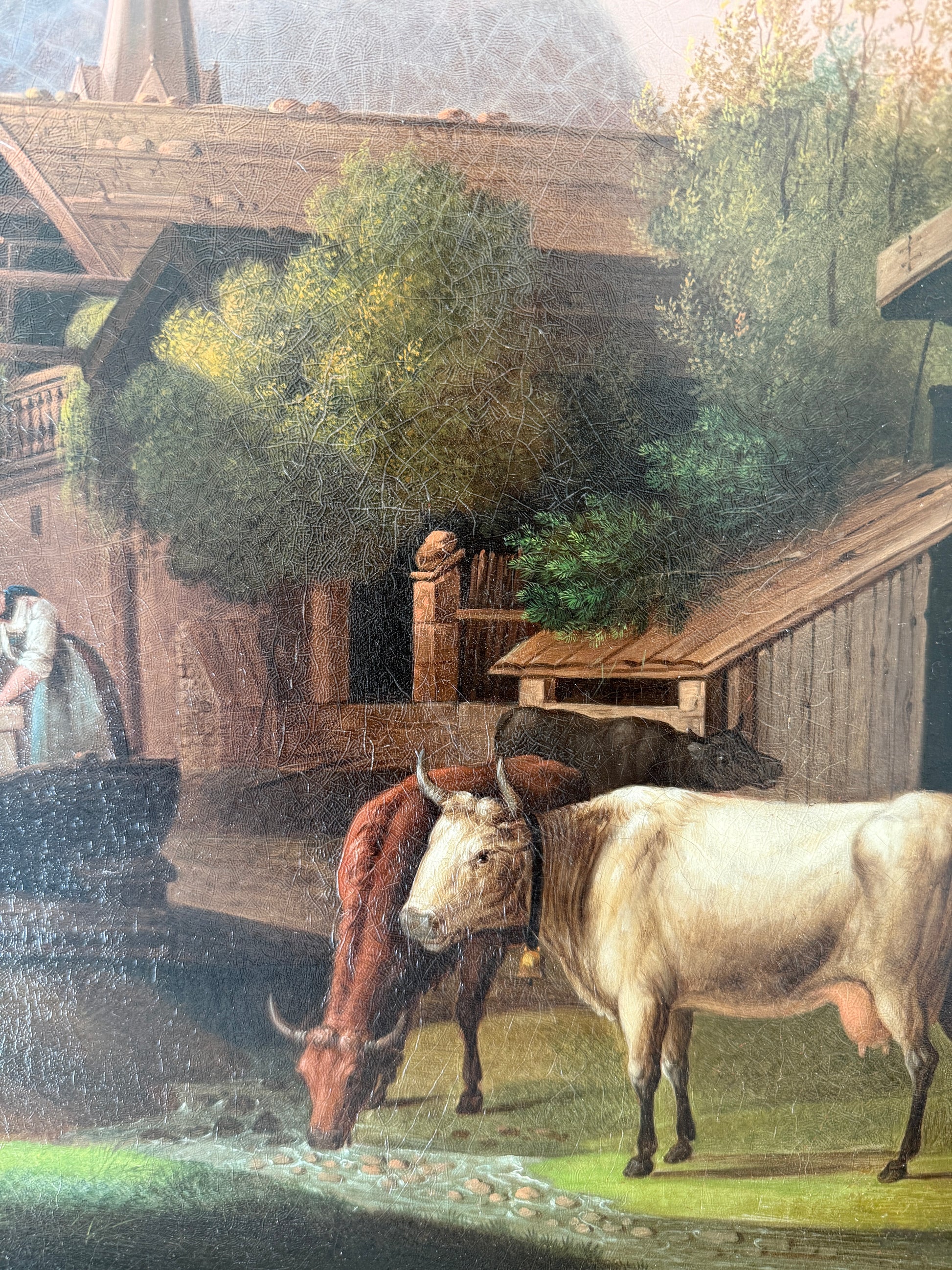 A wonderful original 19th century oil painting copy of Peter von Hess's 'Morning in Partenkirchen'. This romantic scene depicts neighbors at the foot of Germany's highest mountain, the Zugspitze. The oil does justice to the breathtaking views and Bavaria charm of this idyllic location. Beautifully housed in a gilt and ebony frame with bead-course and tulip mouldings. Unsigned. On canvas laid to board
