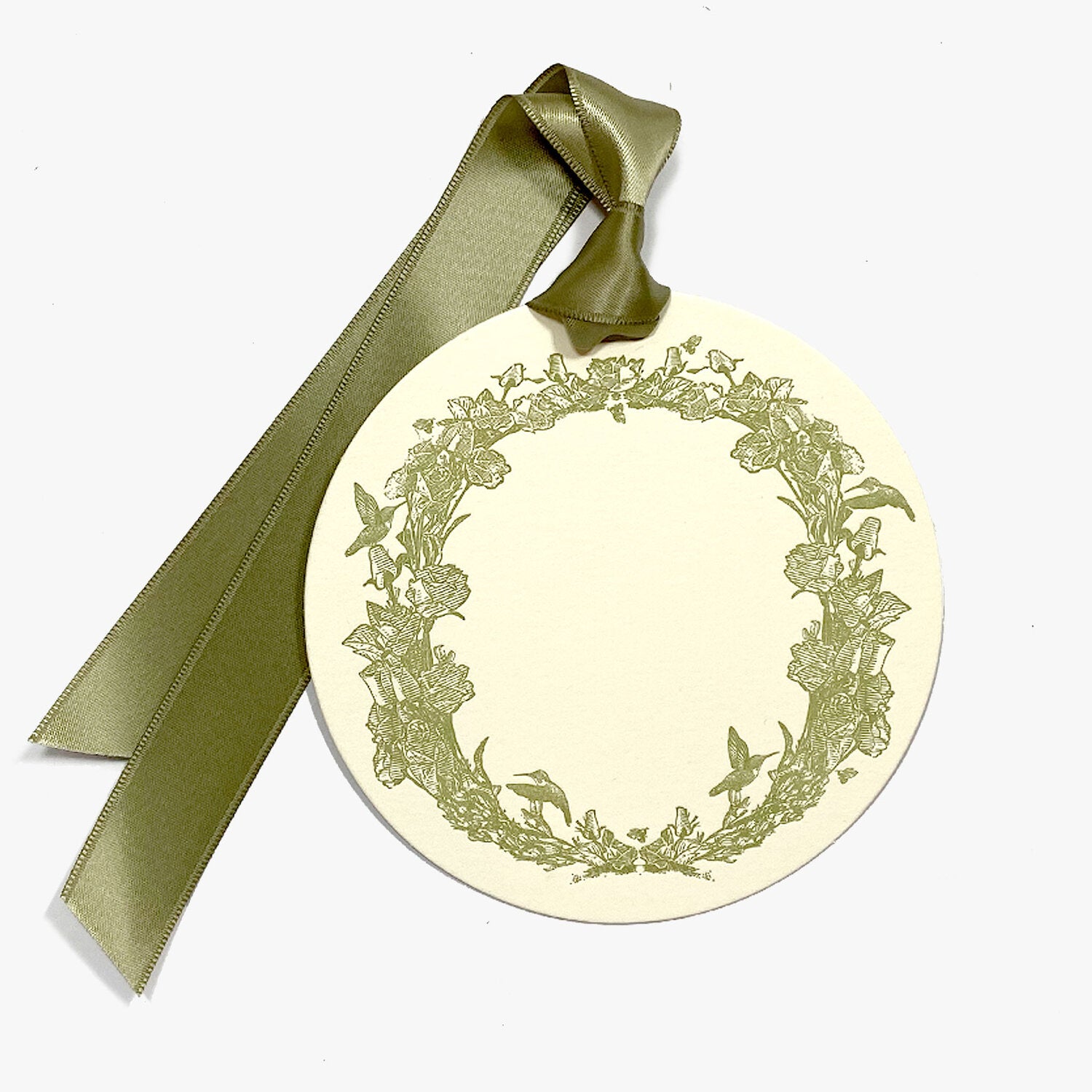 4 letterpress gift tags with 4 satin ribbons. Each tag is pressed on 220-lb, 100% cotton paper. 4” x 4”.