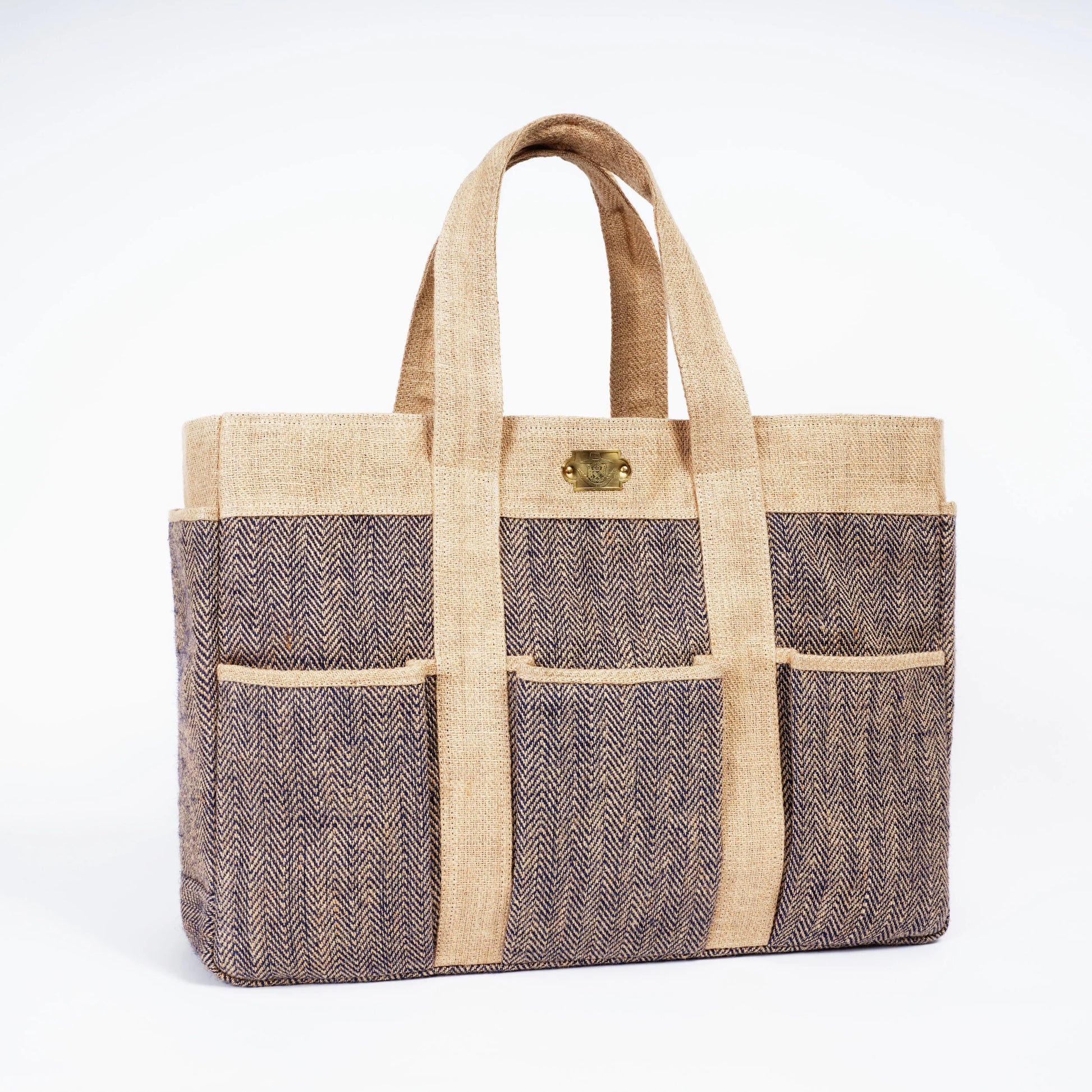 It is a tote-style shoulder bag, in beige jute with a chevron pattern, with a lining in 100% cotton fabric with ochre and carmine patterns on a navy blue background.