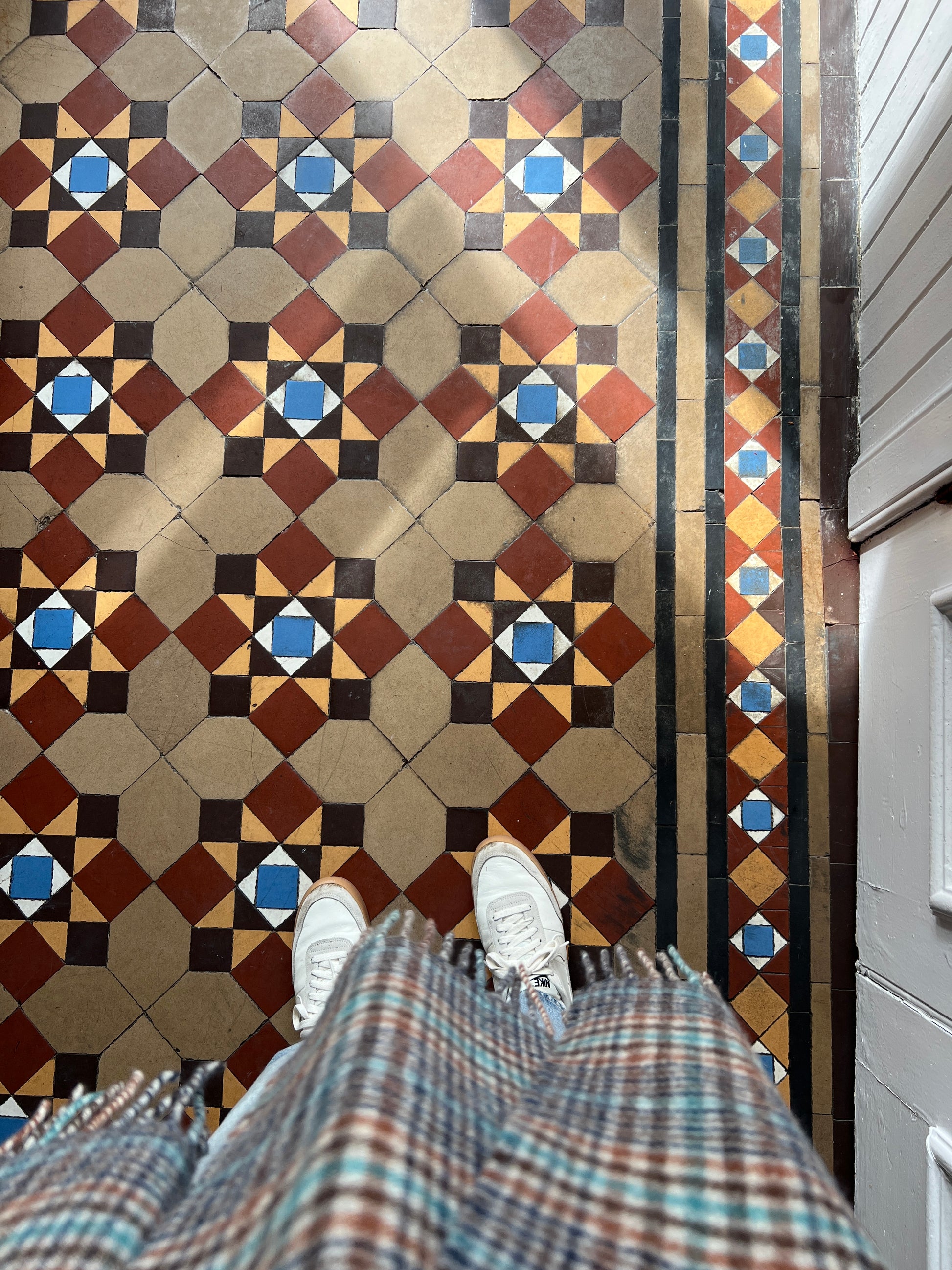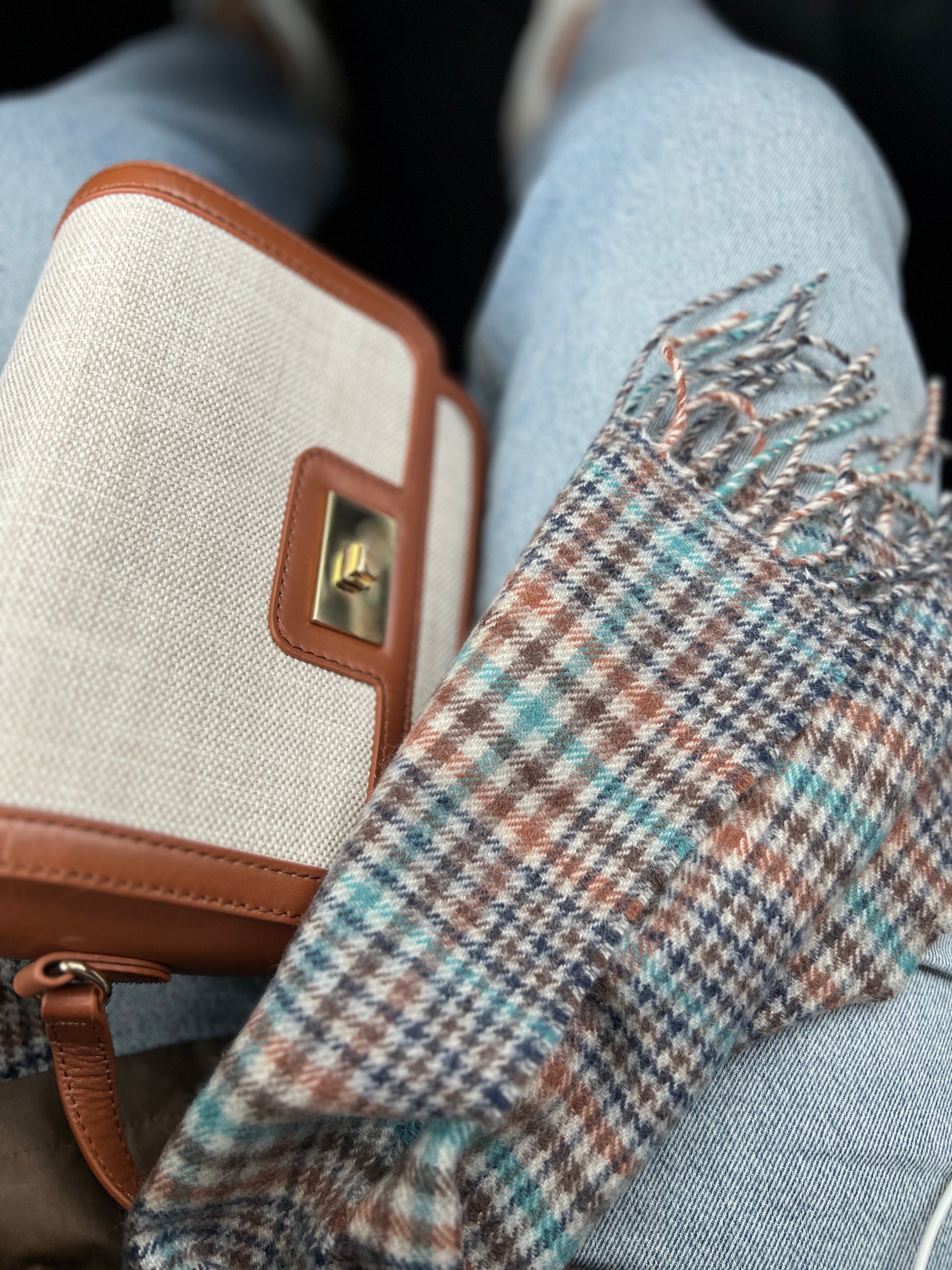 Lindean estate check is an oatmeal base with shades of brown, rust, turquoise and navy overchecks.
