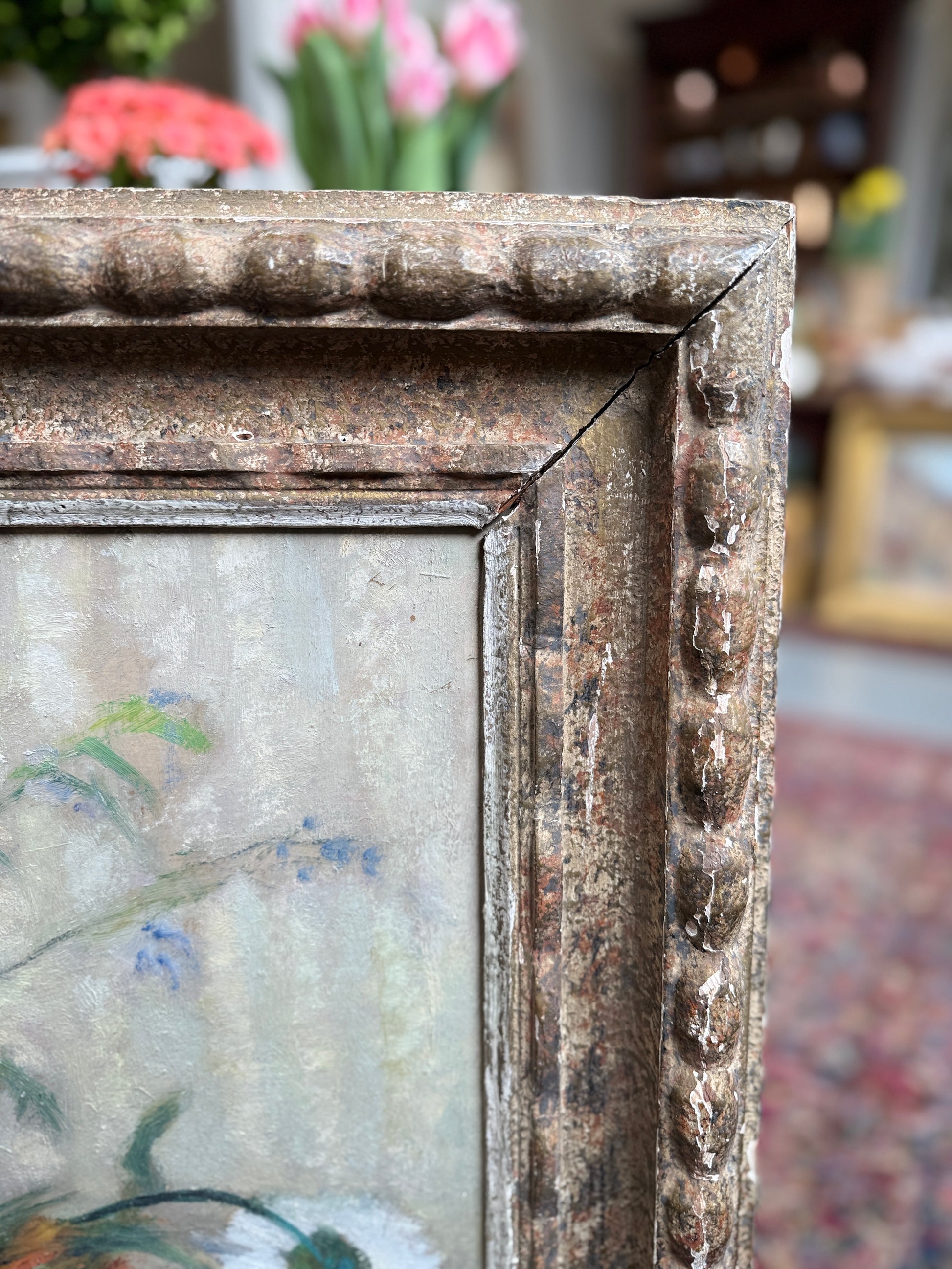 The condition is typical for a picture of this age, including some craquelure to the surface of the painting and scuffs. The old antique frame is charming in all its imperfections.