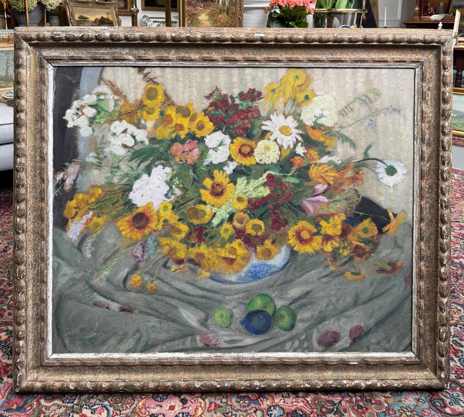 A beautifully large, expressive piece depicting wildflowers arranged in a shallow vase on folded cloth. Signed to the lower right. Presented in a distressed gesso frame. Studio stamp to frame verso. Another still life oil can be found to the reverse. On board.