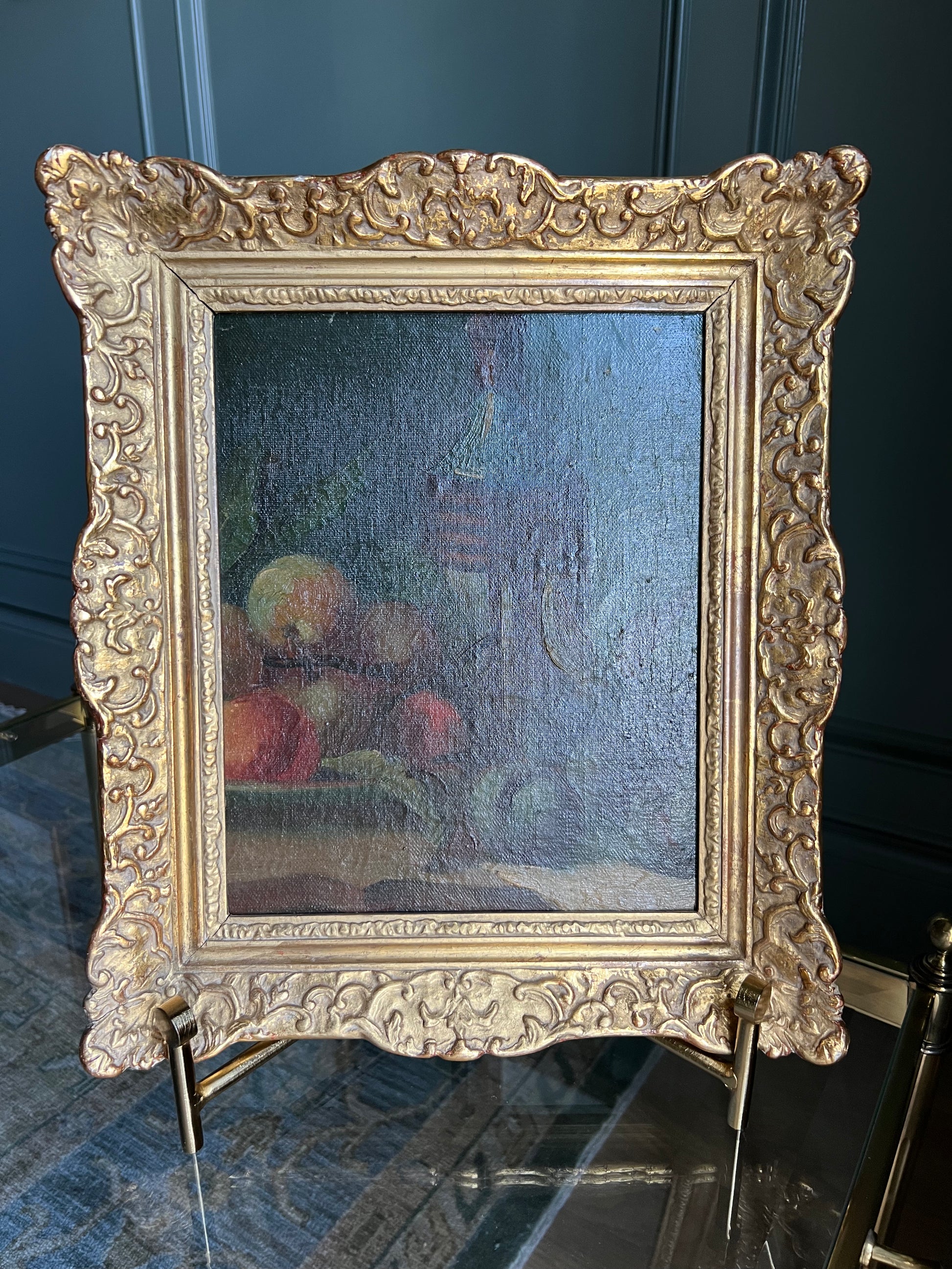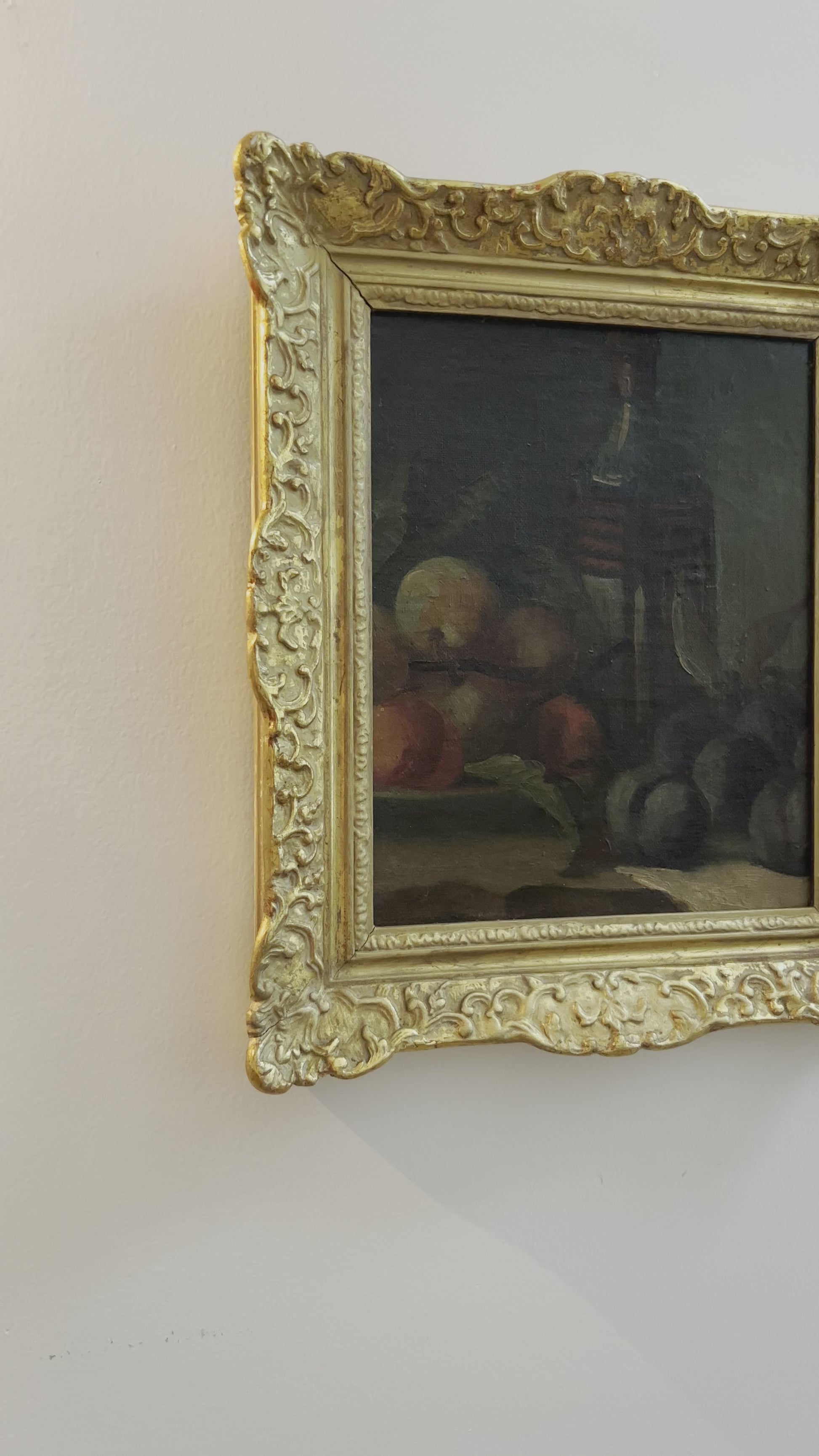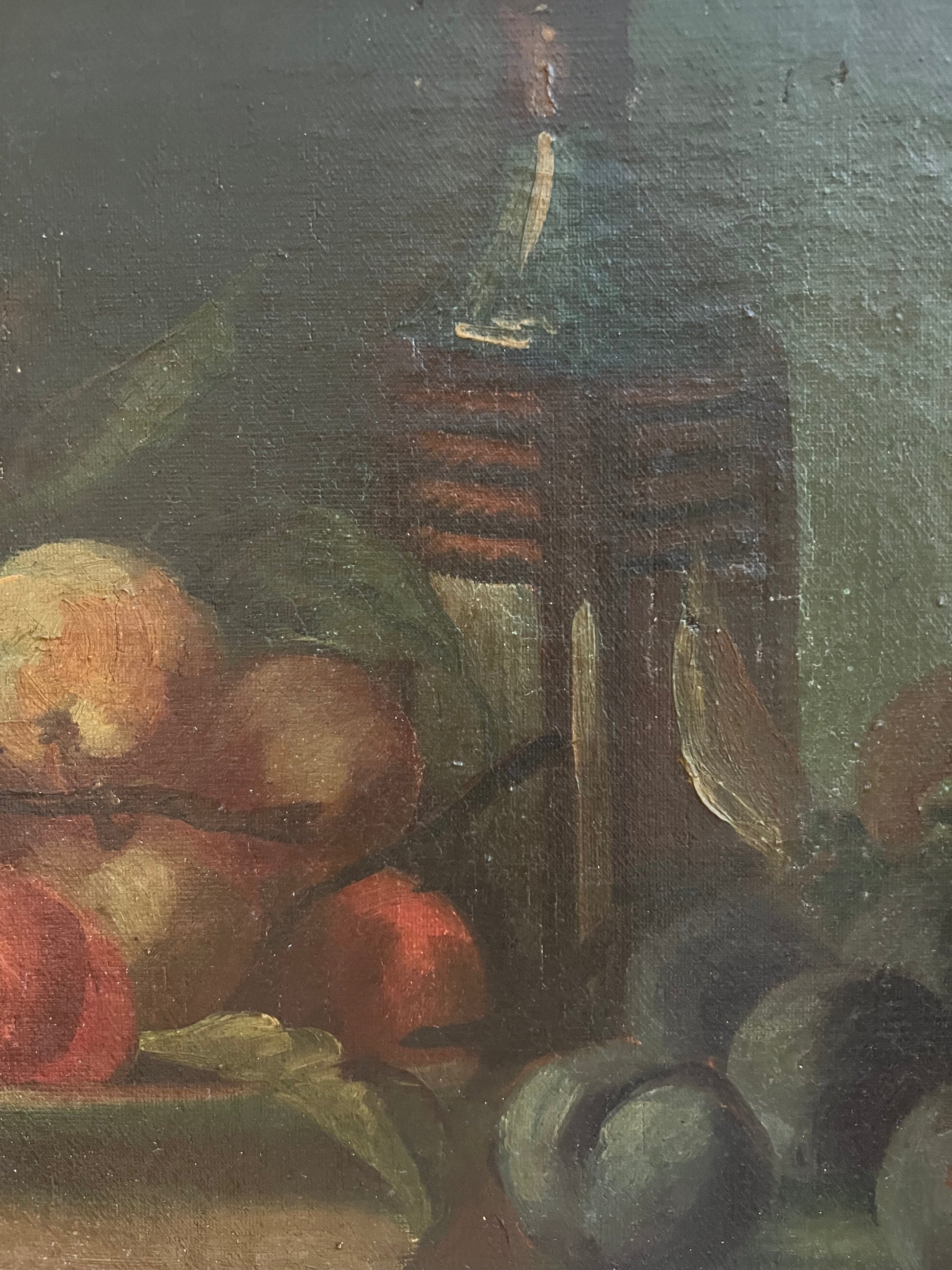 19th century antique oil painting of a beautiful still life full of plums & fruit. Dark and moody, very fine art, great condition, antique wood gold frame. Would be beautiful in a kitchen or gallery wall. 15.5” x 13.5” framed size.