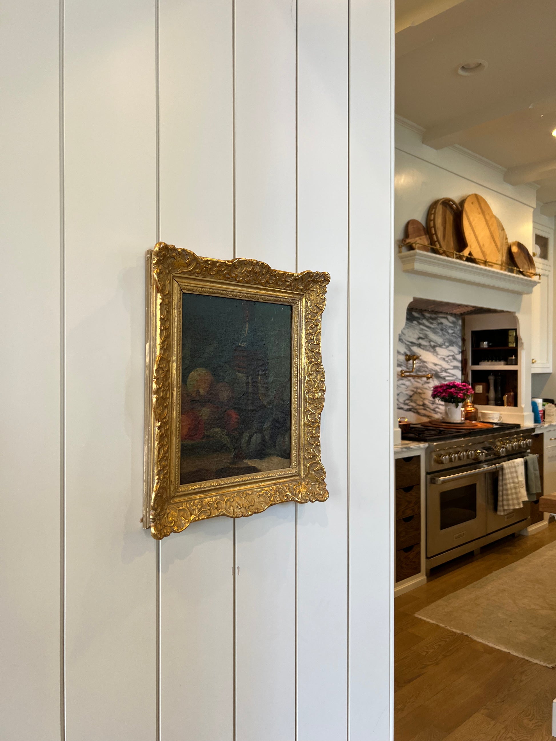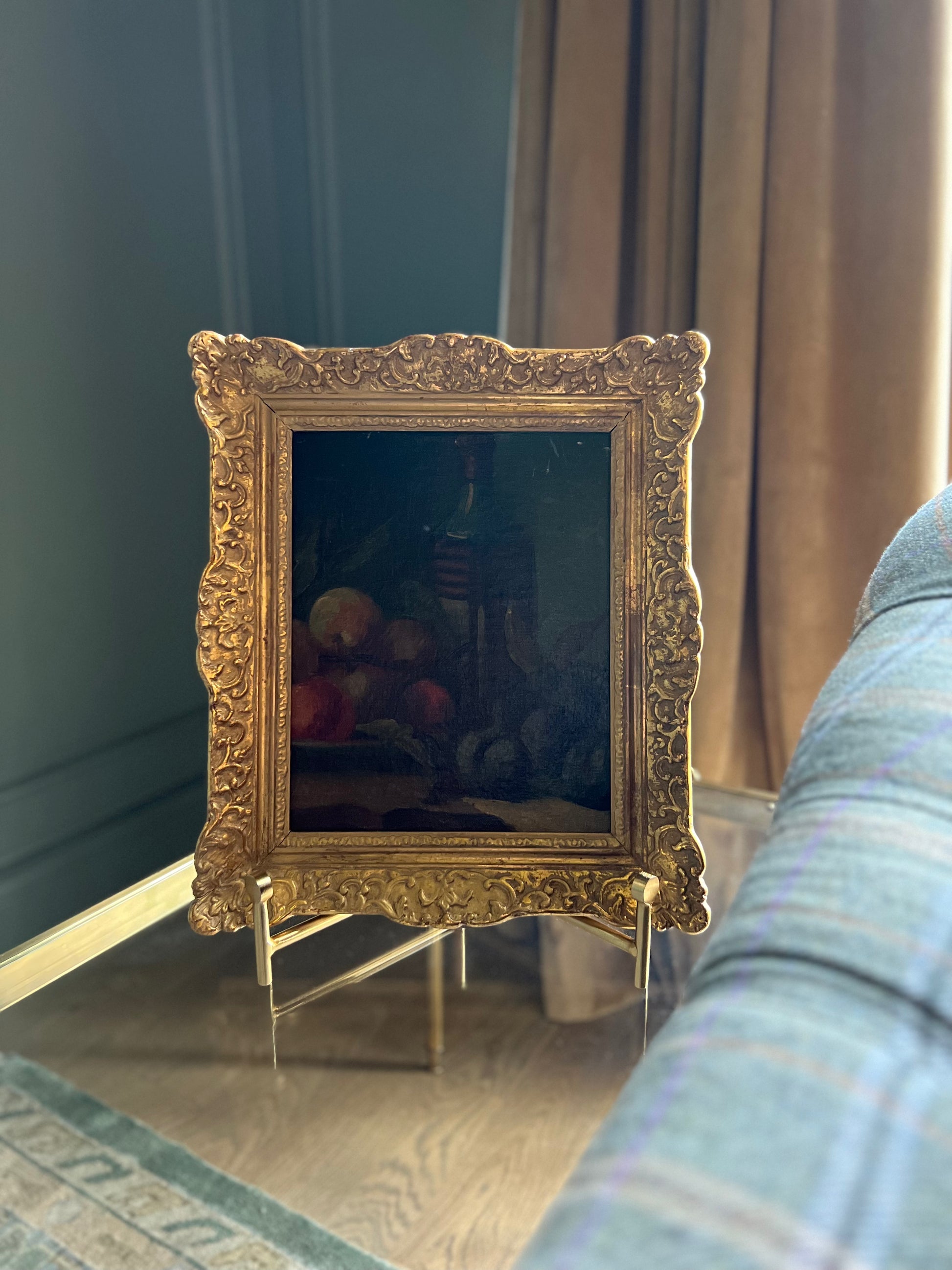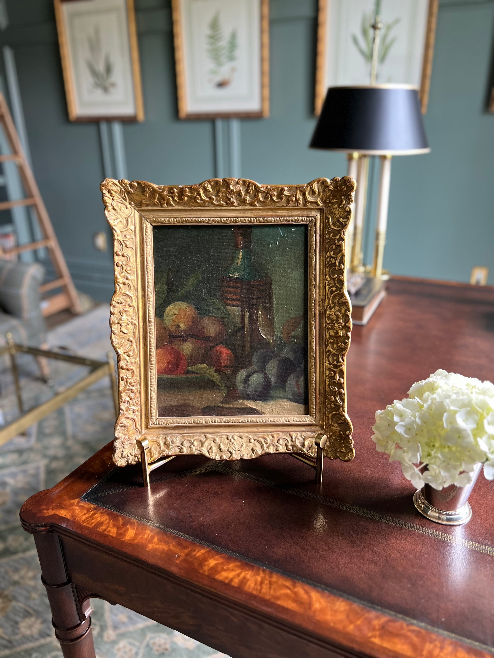 19th century antique oil painting of a beautiful still life full of plums & fruit. Dark and moody, very fine art, great condition, antique wood gold frame. Would be beautiful in a kitchen or gallery wall. 15.5” x 13.5” framed size.