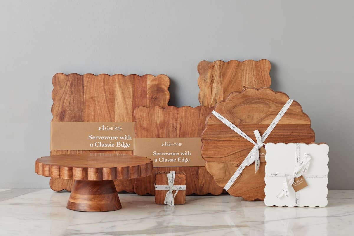 Discover the perfect blend of modern style and whimsical charm with our Rectangle Scalloped Cutting Board. The unique scalloped edges add movement and subtle femininity while the natural acacia wood grain adds texture to your countertop. With its trendy design, this functional piece of art will become a staple in any kitchen. Inspired by the classic architecture of 18th Century Europe, the Scalloped Collection captures this old-world charm while blending seamlessly into contemporary aesthetics. This board is adorned with a luxe kraft belly band for seamless merchandising.