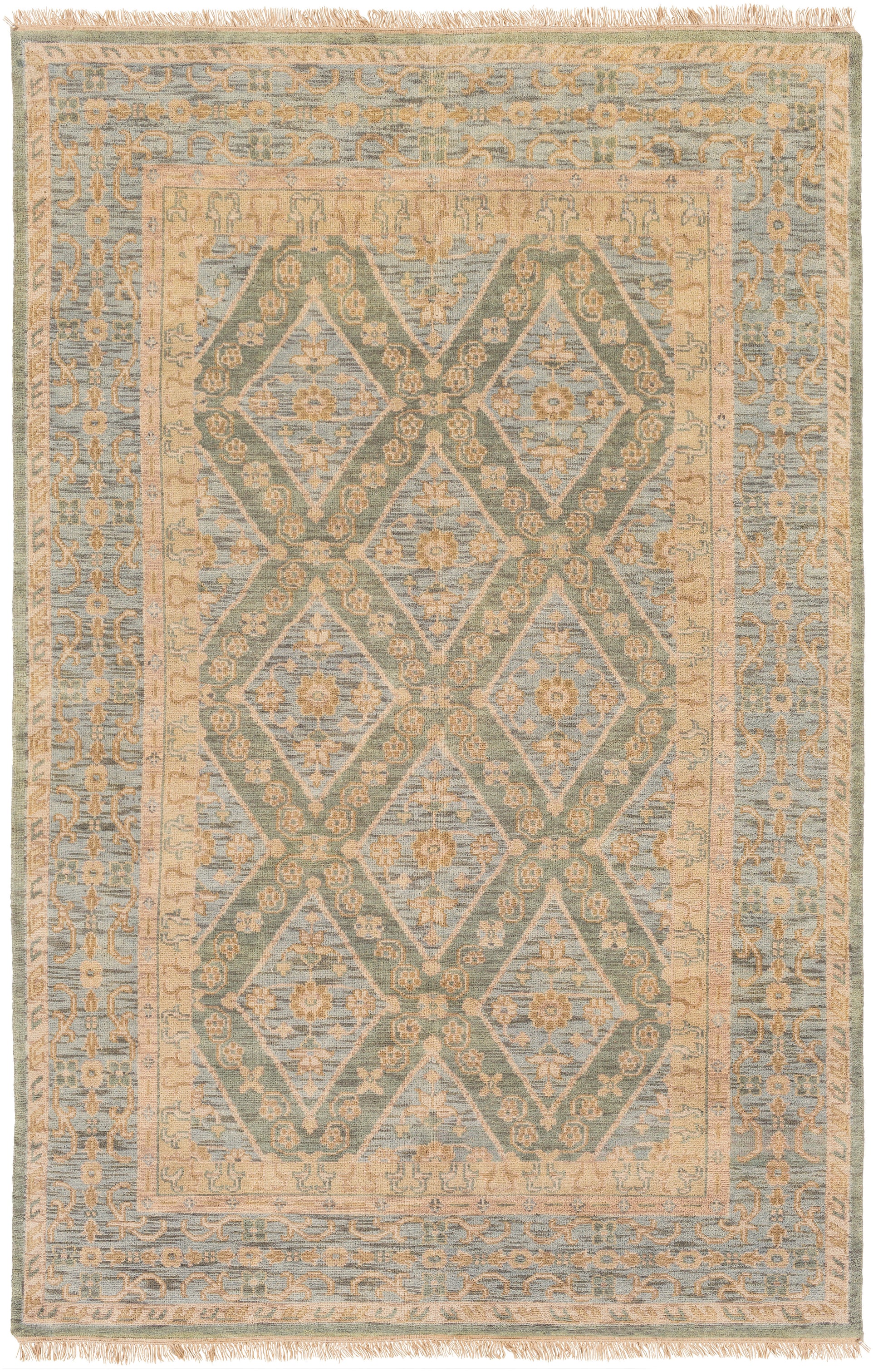 Clearance! The most velvety soft green and soft gold rug with Lattice and border. Stunning, will catch the eye and most glorious in person. Featured in our Library and mud room runner at home.