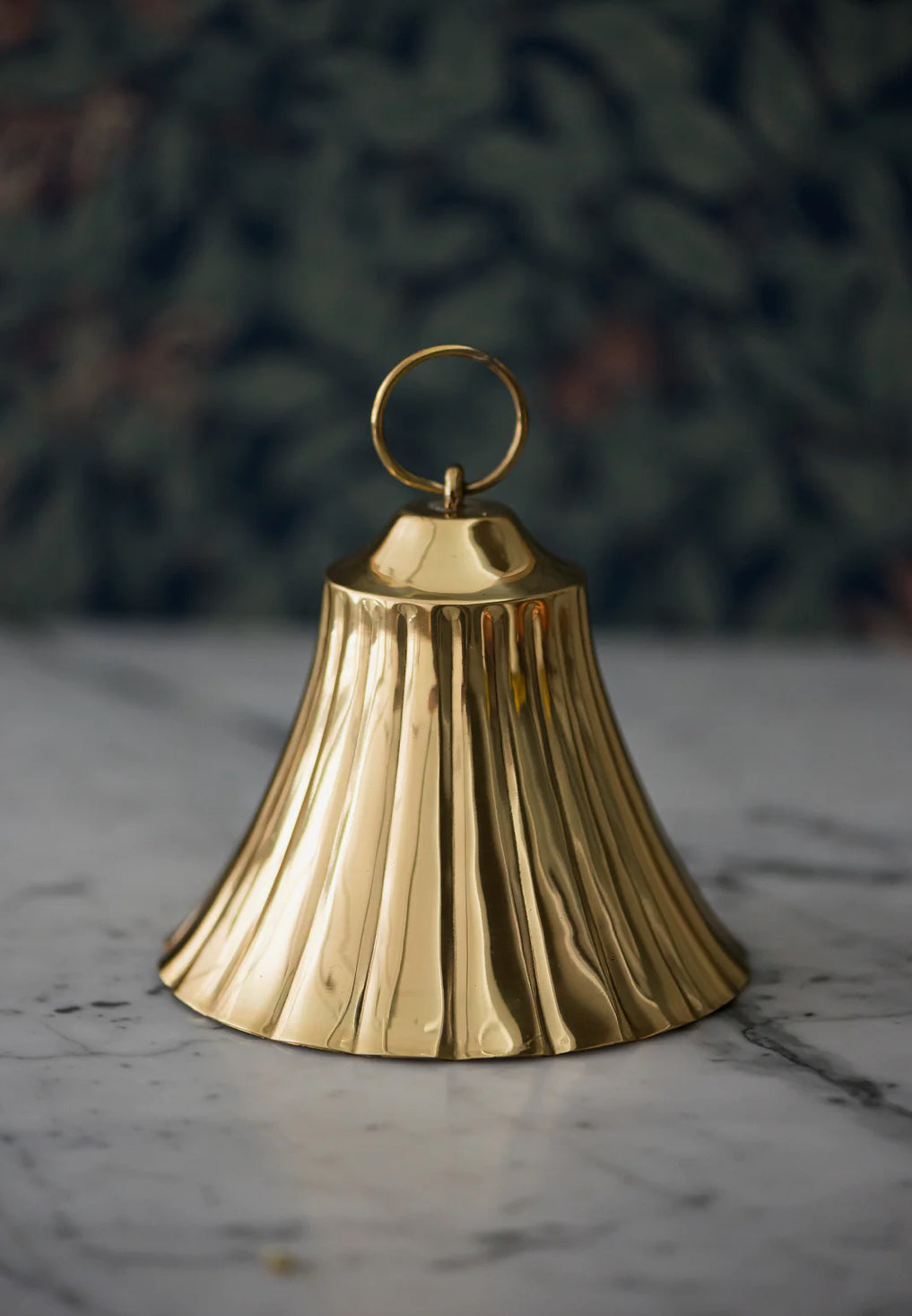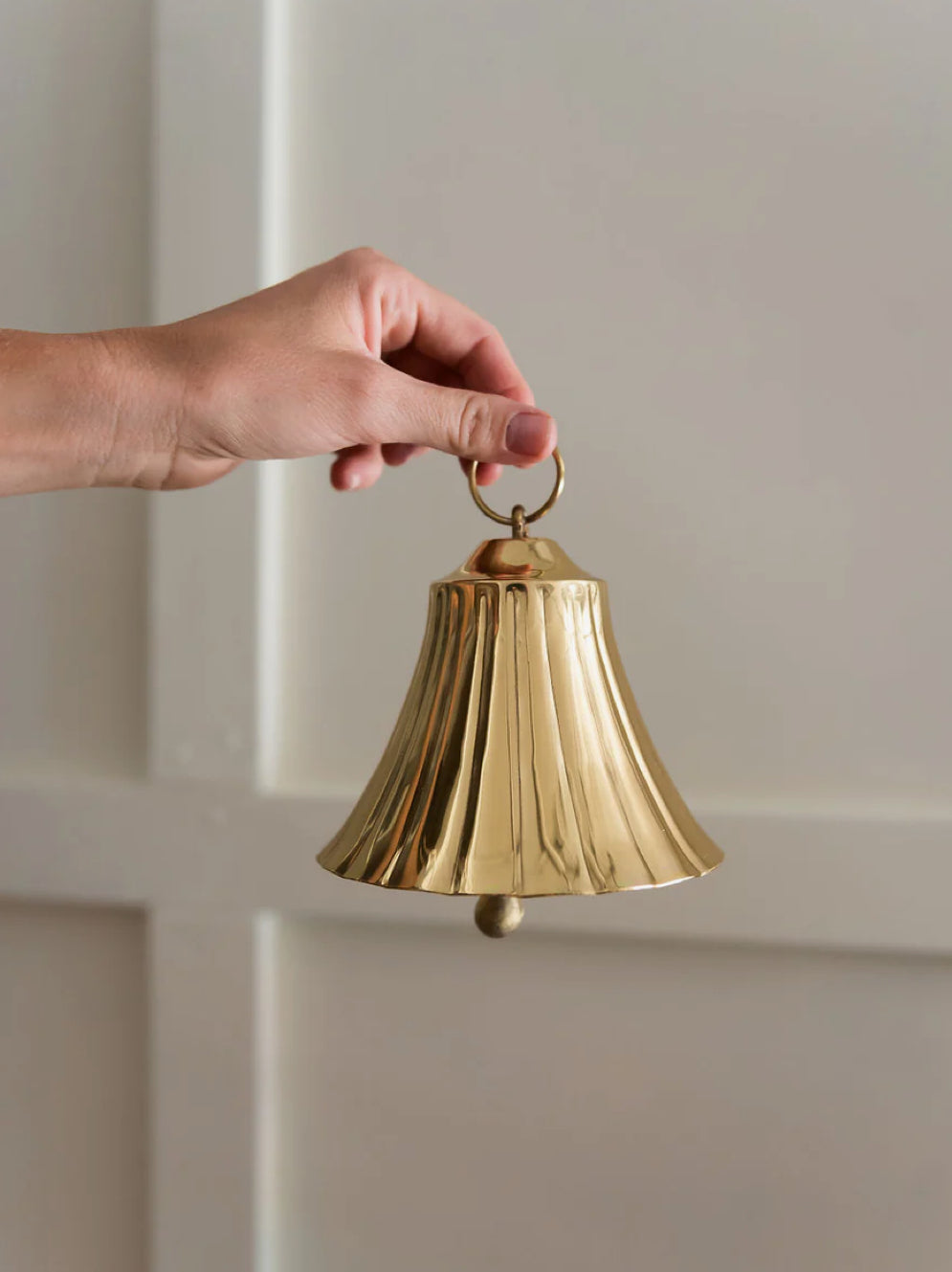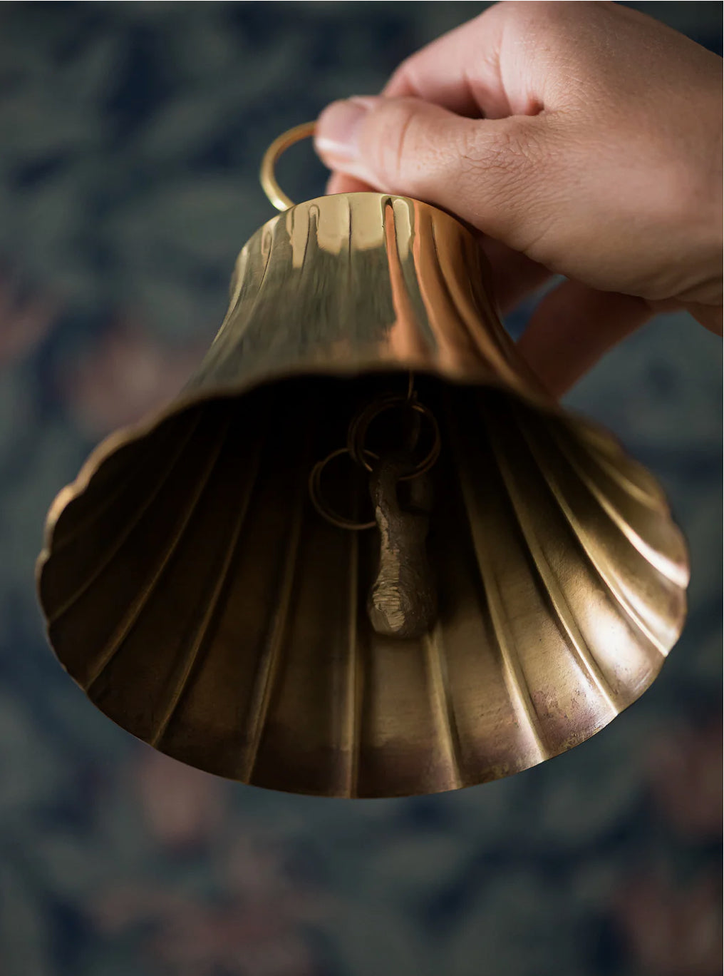 A brass bell made entirely out of brass. The scalloped detail gives a simple bell a sophisticated look. This bell can hang from a wreath, be set as a decorative object on a shelf or coffee table, hang from a banister, drape over a mantlepiece, etc. Our brass bell is 5" wide and 5" tall. These bells have a nice weight to it and are anything but chintzy. Designed in house and manufactured in India. Handmade.