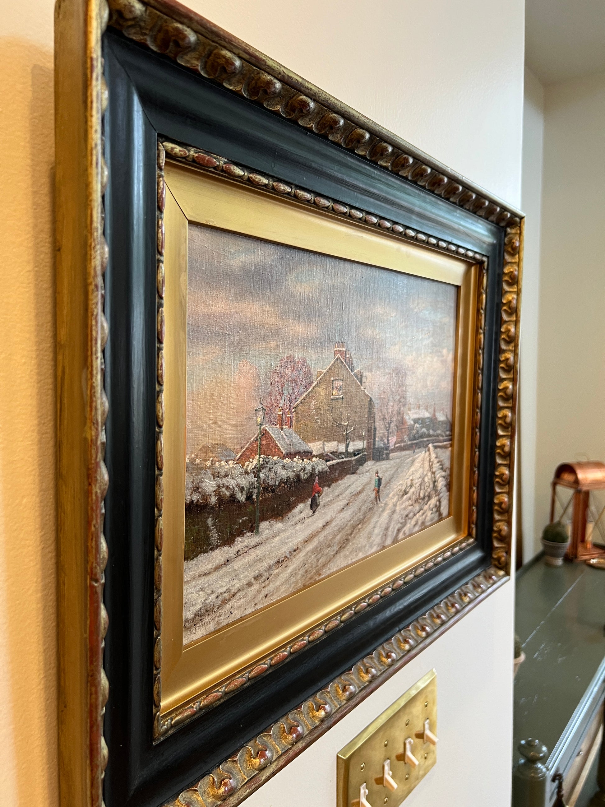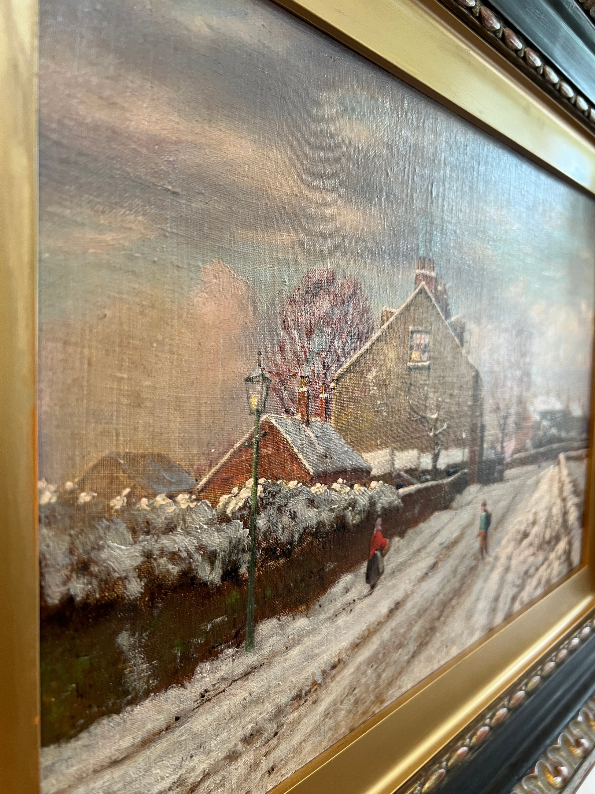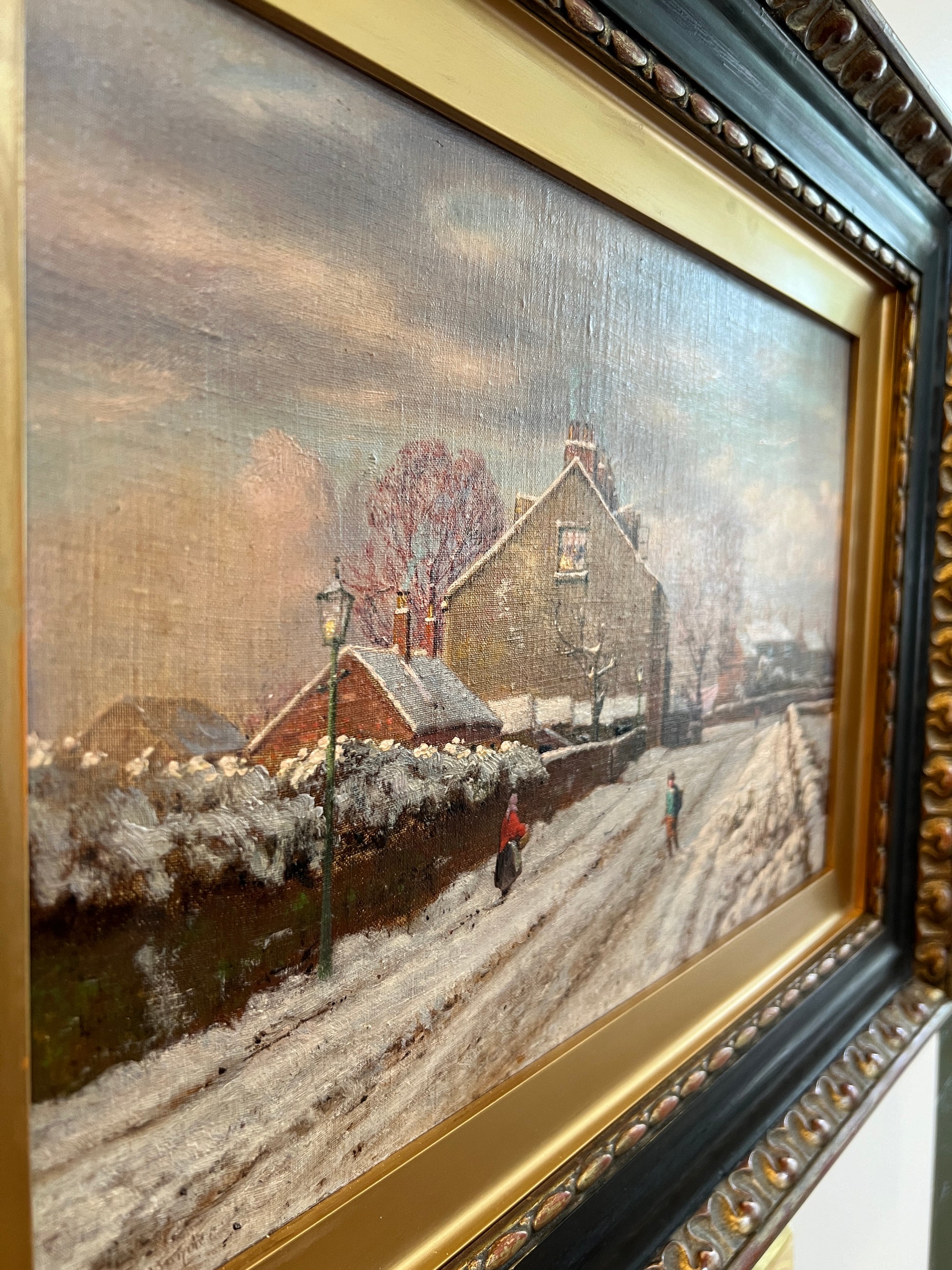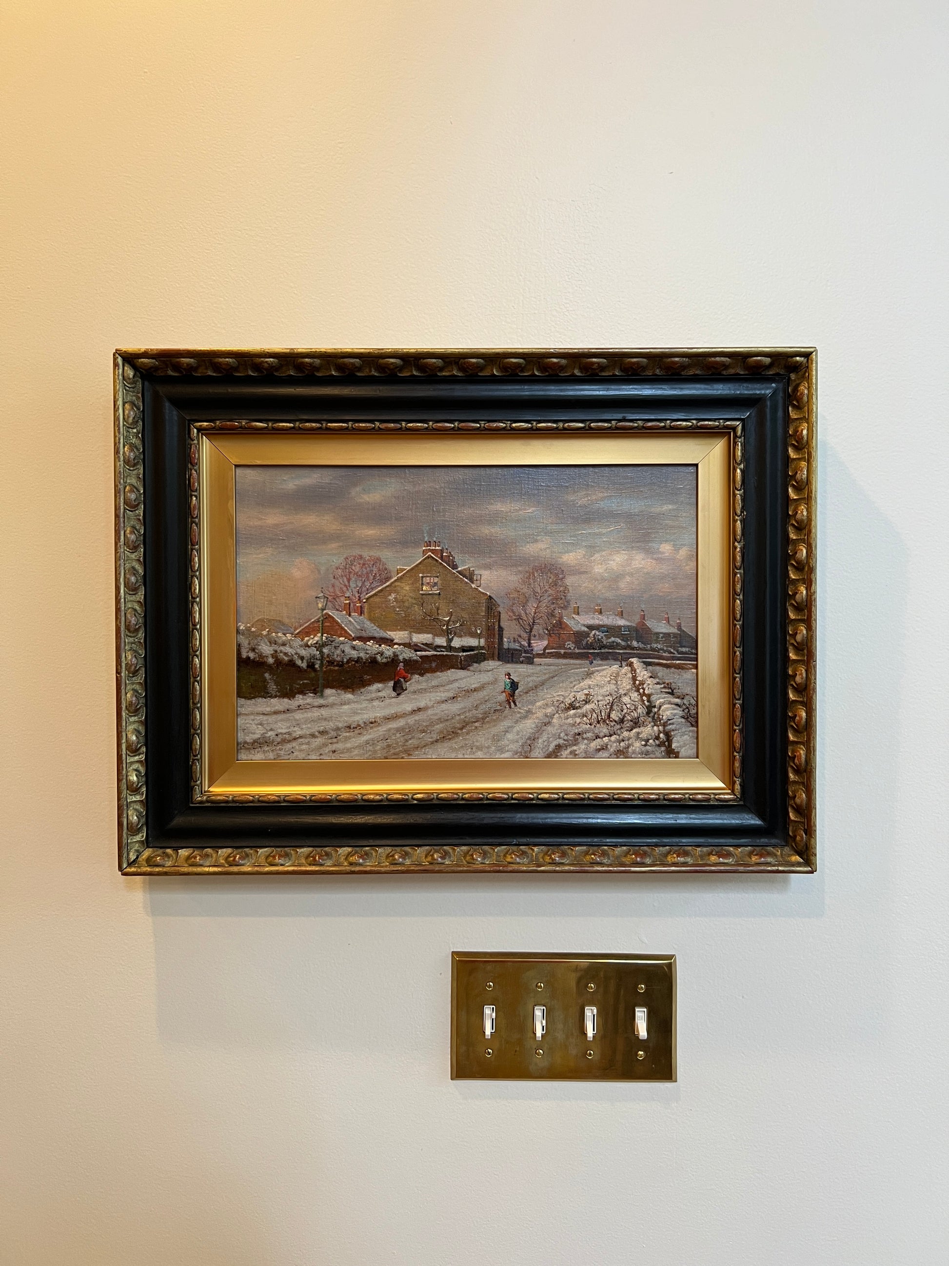 Original antique oil painting found in Scotland on our summer travels. Darling scene of the most idyllic snowy village. You will want to stare at this painting in its stunning frame. About 24” wide framed.