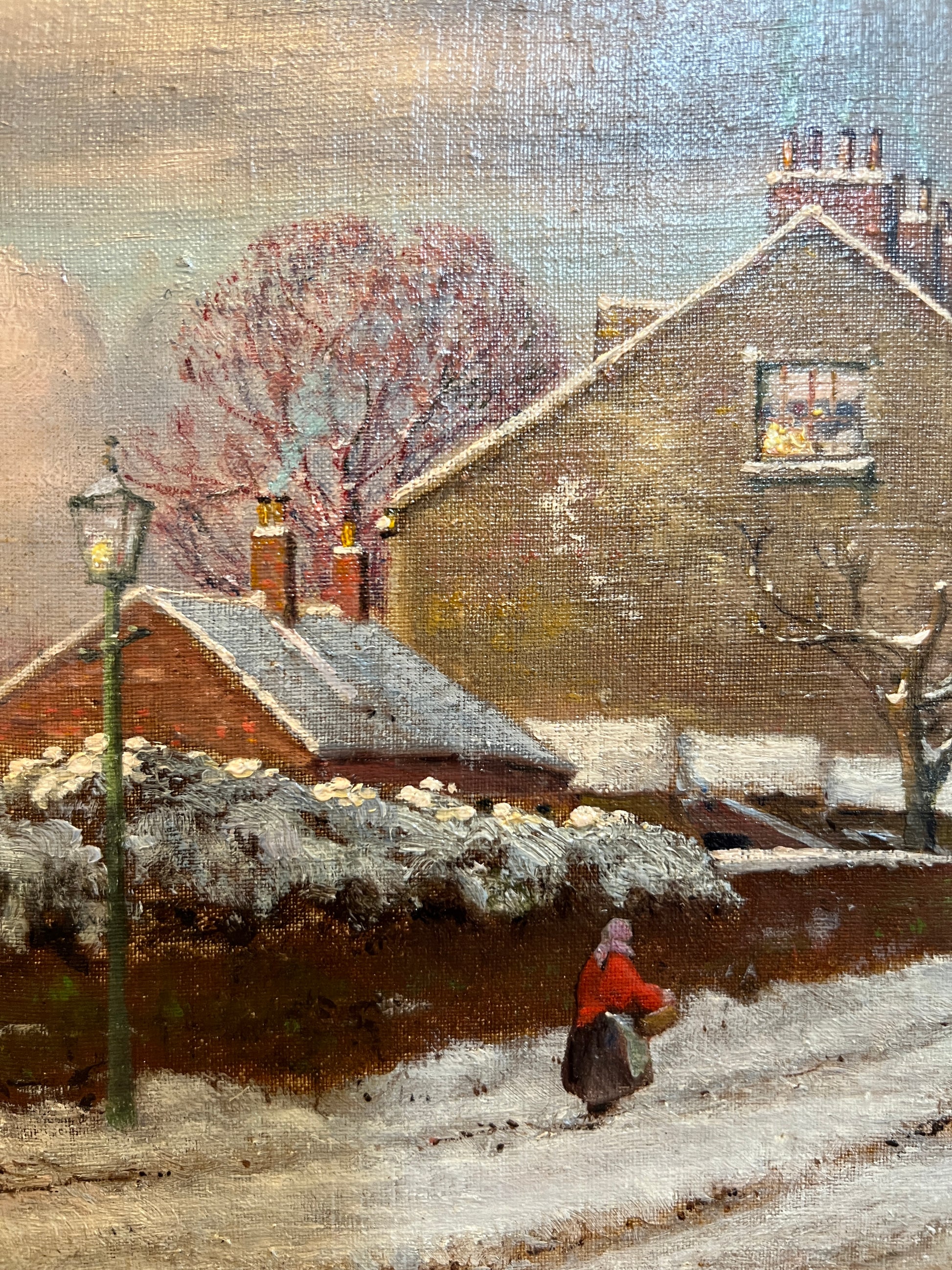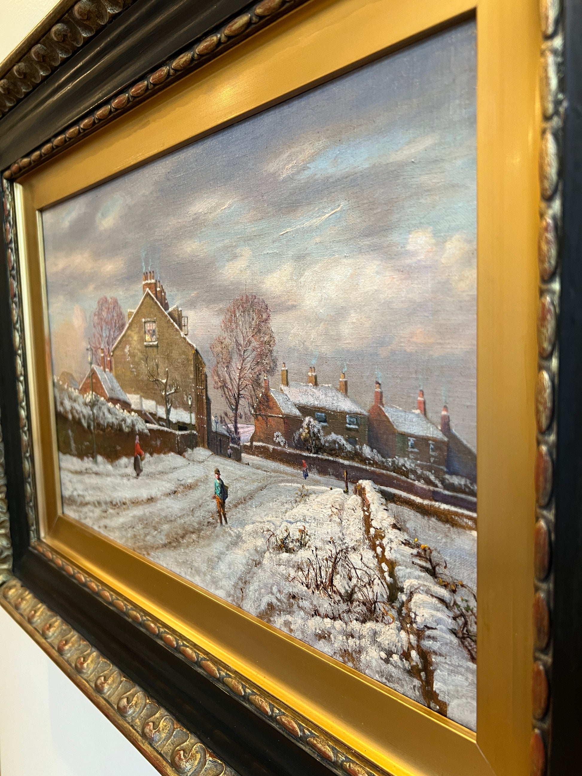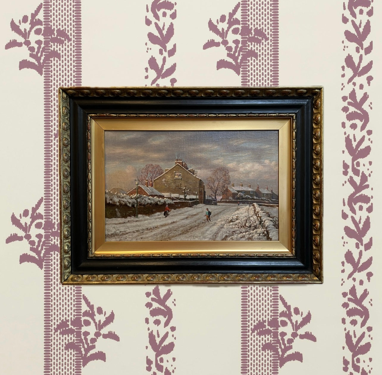 Original antique oil painting found in Scotland on our summer travels. Darling scene of the most idyllic snowy village. You will want to stare at this painting in its stunning frame. About 24” wide framed.