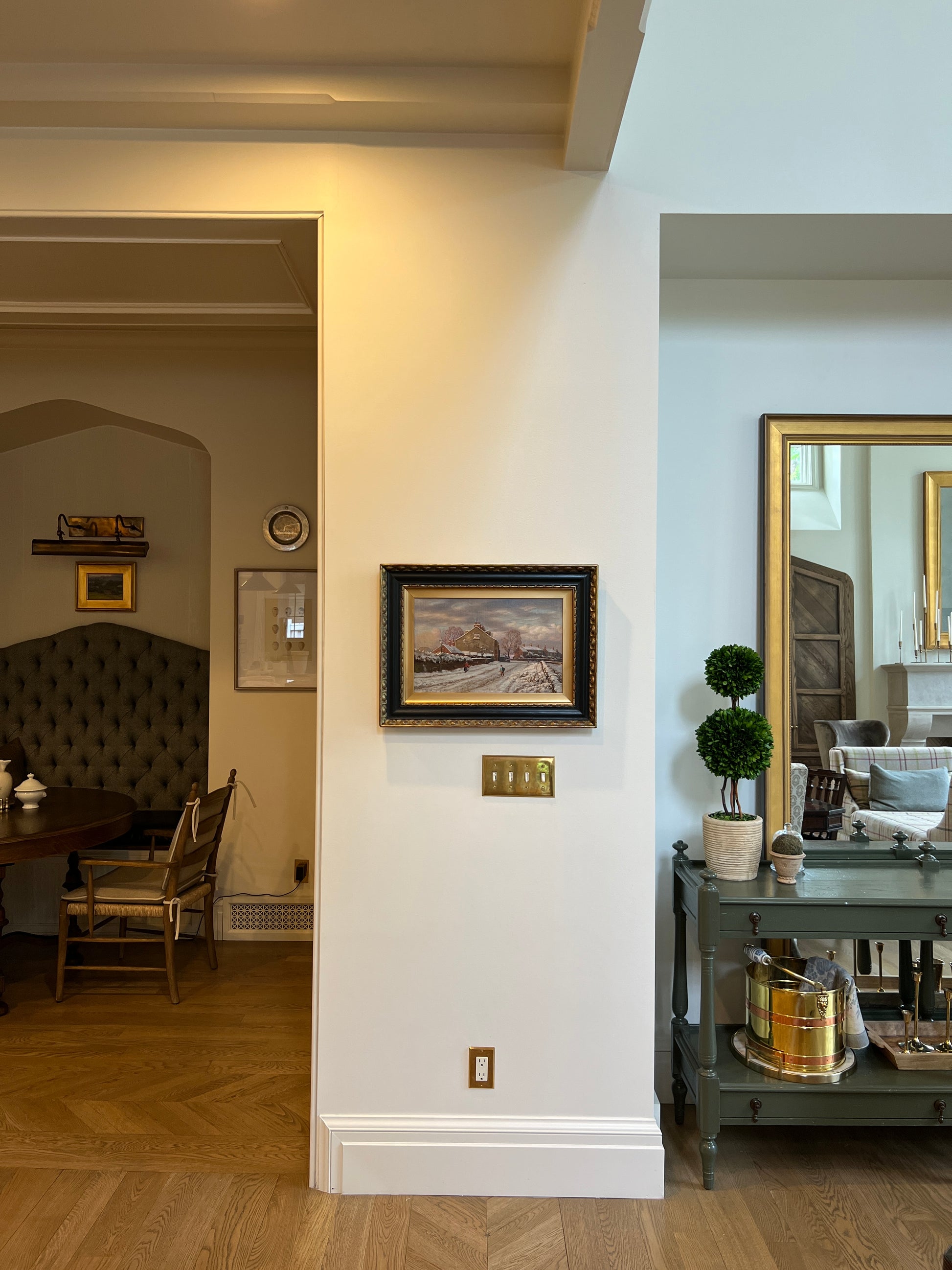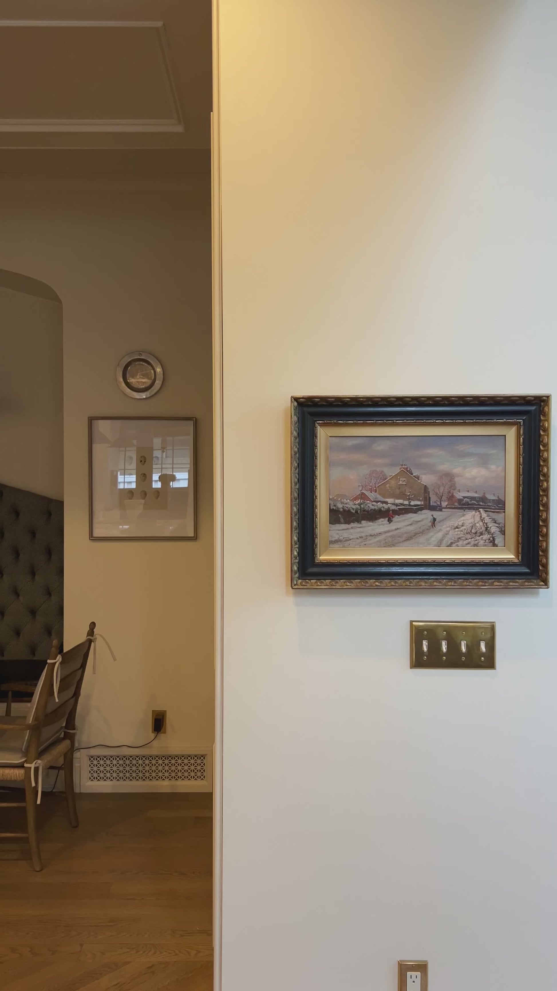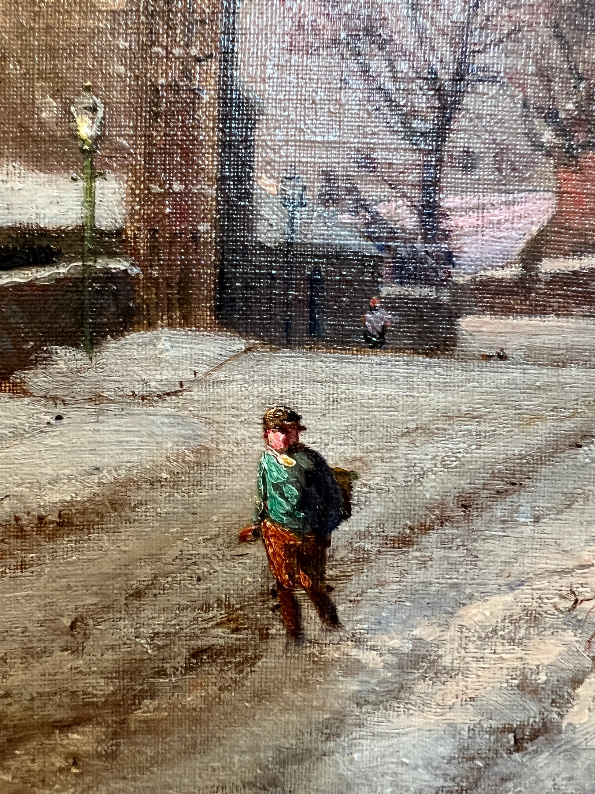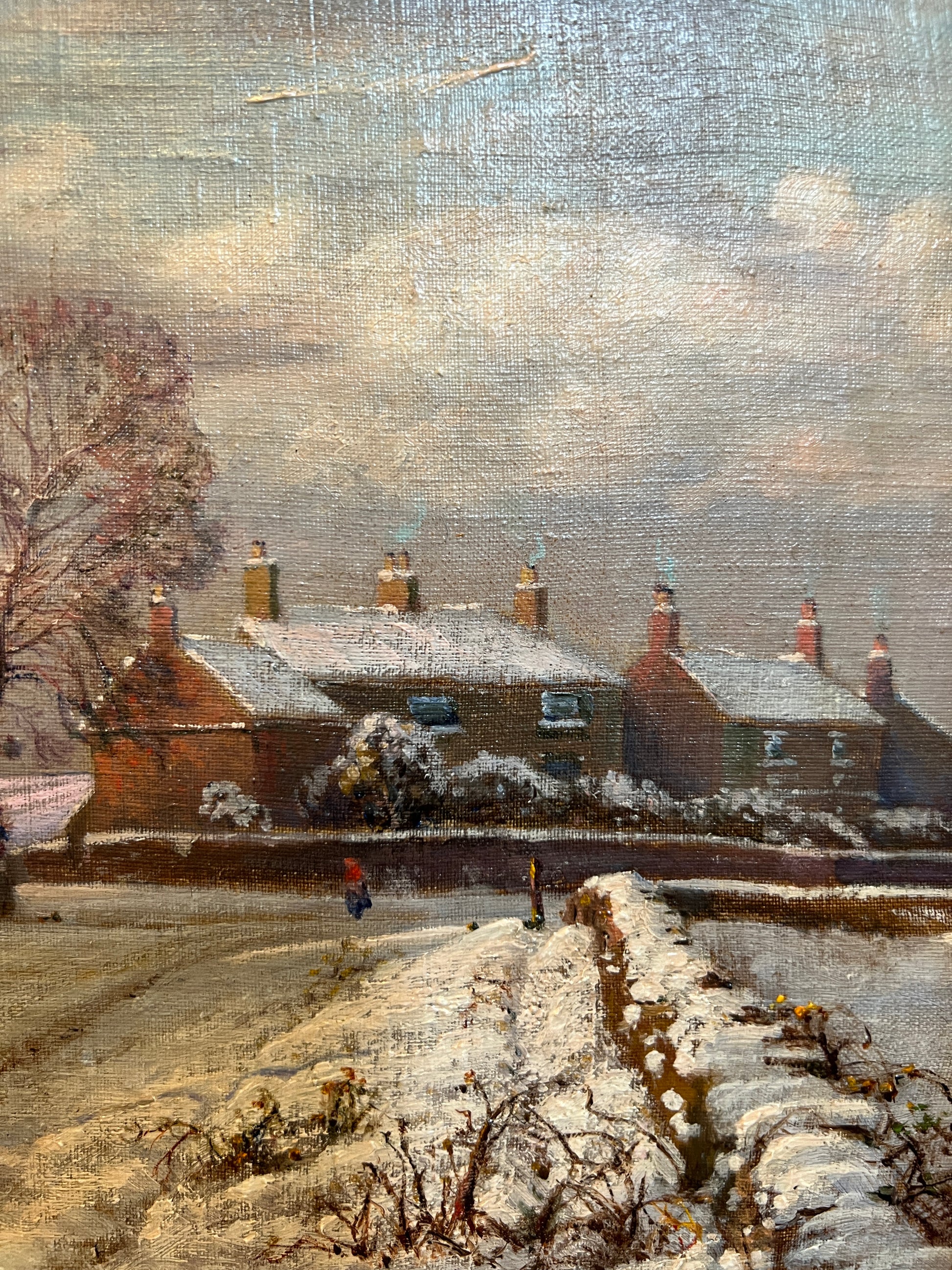 Original antique oil painting found in Scotland on our summer travels. Darling scene of the most idyllic snowy village. You will want to stare at this painting in its stunning frame. About 24” wide framed.