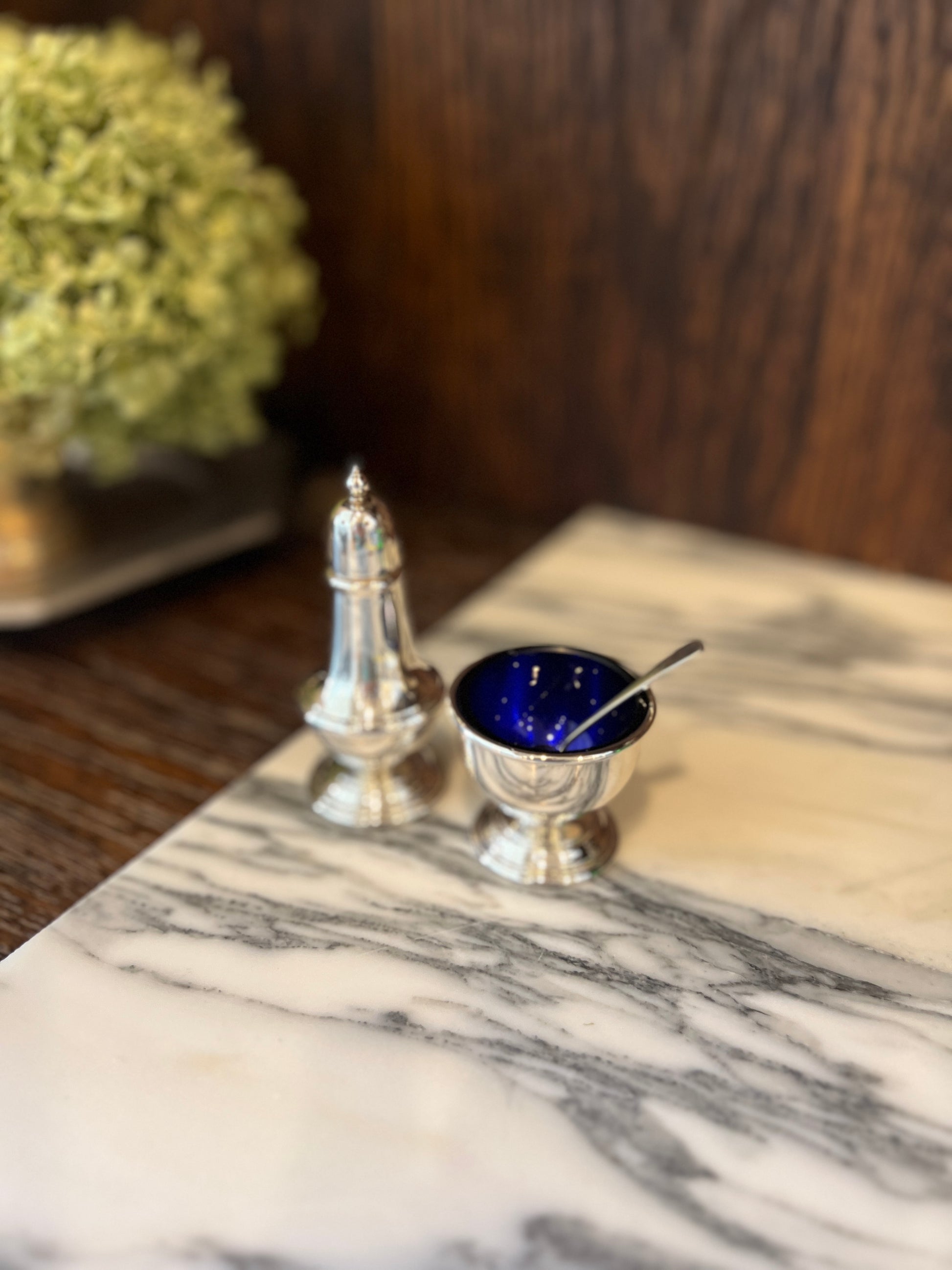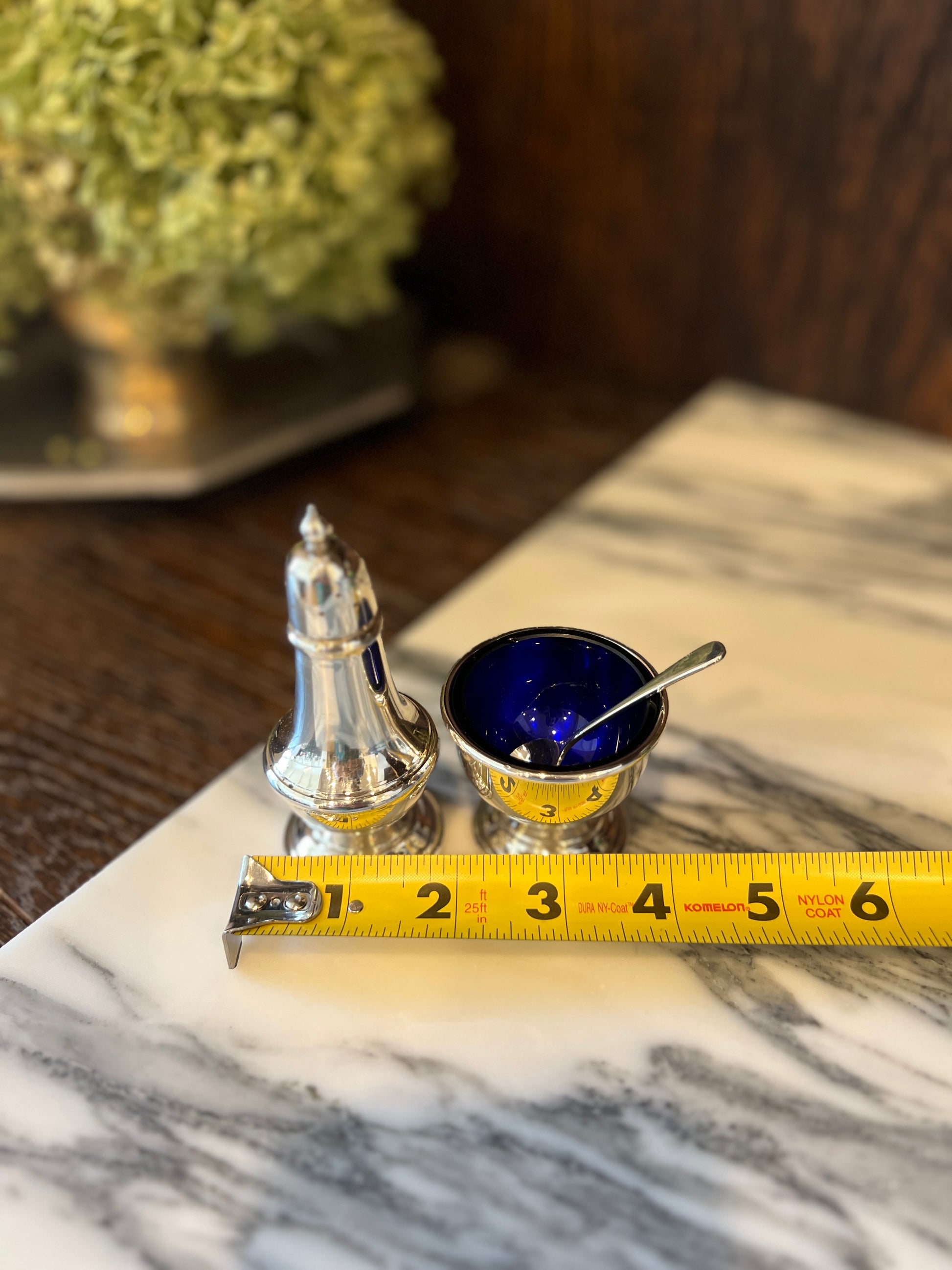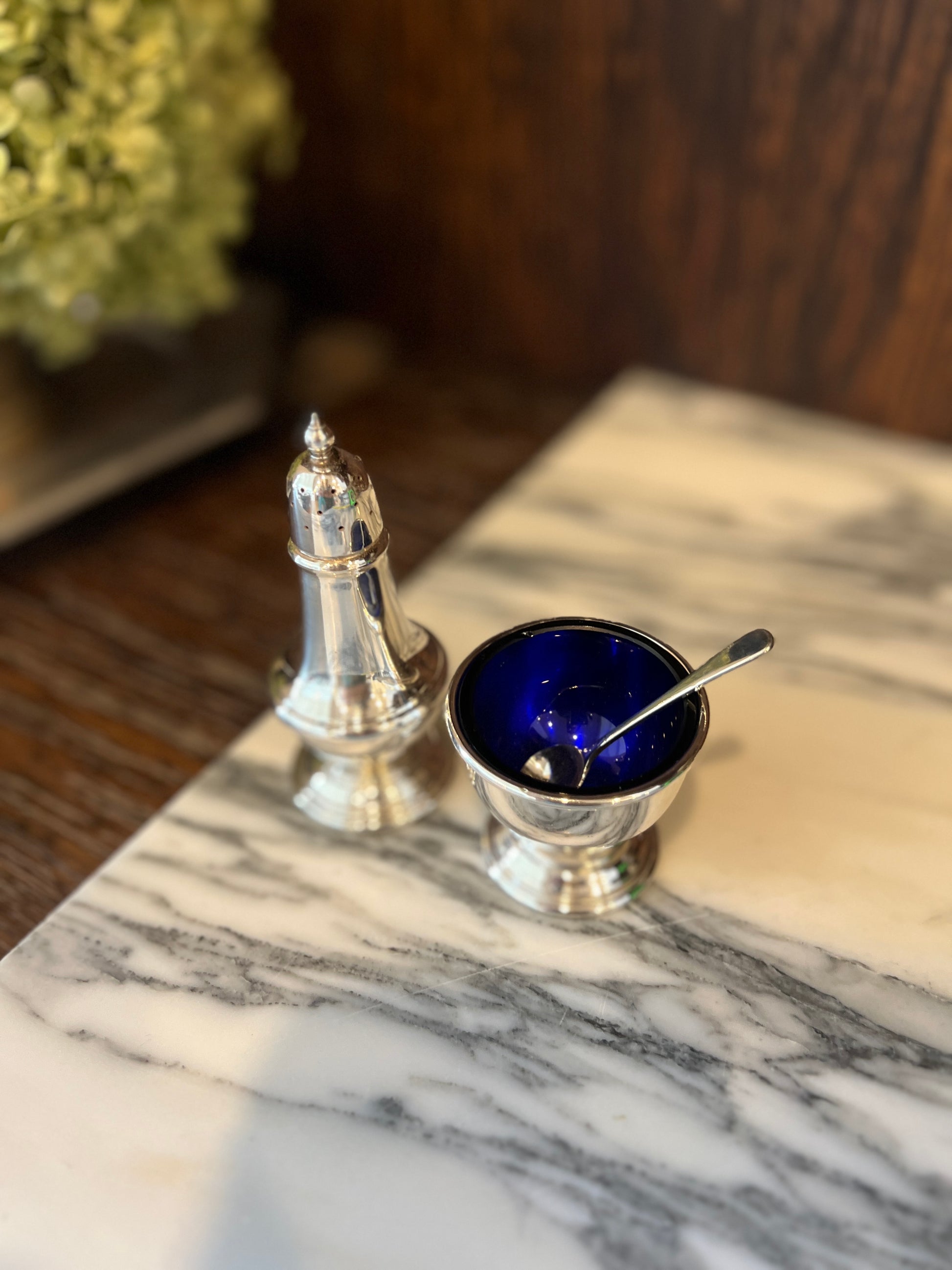 This set includes the shaker and a second condiment jar with the cobalt blue glass insert. This set is in excellent condition.