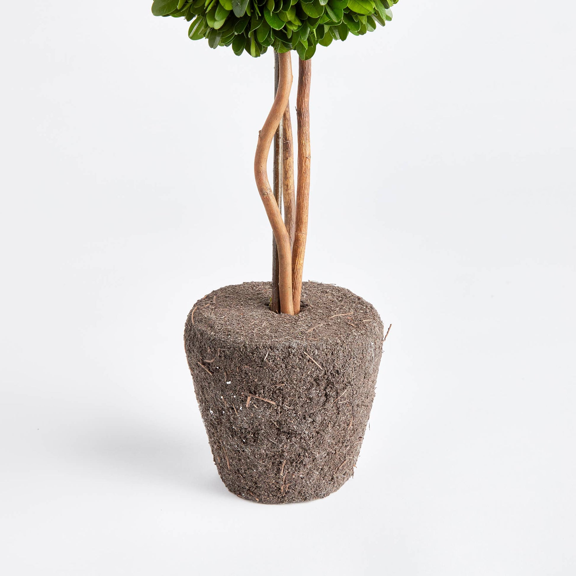 Introducing a novel idea, real English boxwoods with their own standard root ball, ready to drop in to your favorite vessel. Preserved and painstakingly assembled by our masterful topiary artists, and now customizable to your choice of pot. The possibilities are endless! Preserved boxwood. Root ball: 4.5 x 4.5 x 4. Intended for indoor use. Keep away from direct sunlight to help minimize fading. Lightly mist with water in dry arid environments. Excessive misting will cause mold and mildew. Avoid damp, dark and humid conditions. 16” Tall