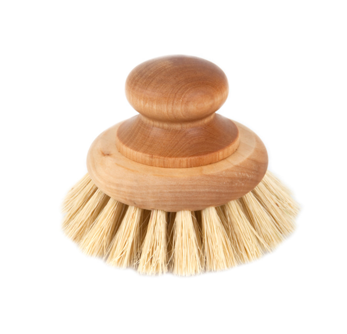 The larger pot brush has a 5” base diameter and is 3.5” tall. It has a stiff brush made of Tampico Fiber and is suitable for tougher cleaning such as pans and pots, but can also be used as a scrub brush for various cleaning.