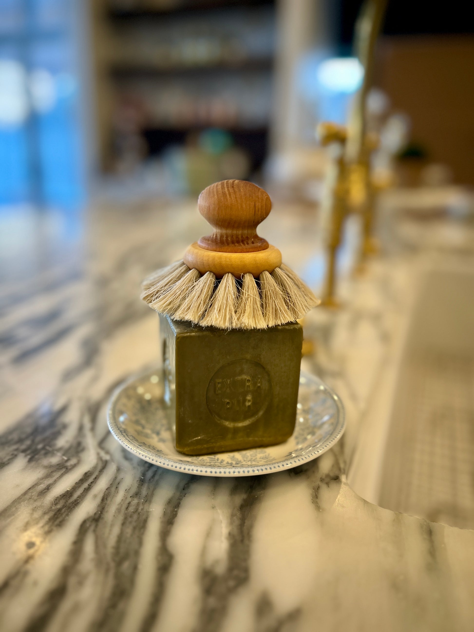 The smaller dish brush has a 3.5” base diameter and is 3” tall. It has a softer brush made of horsehair and is great for all dishes. I use this one daily for all dish washing.