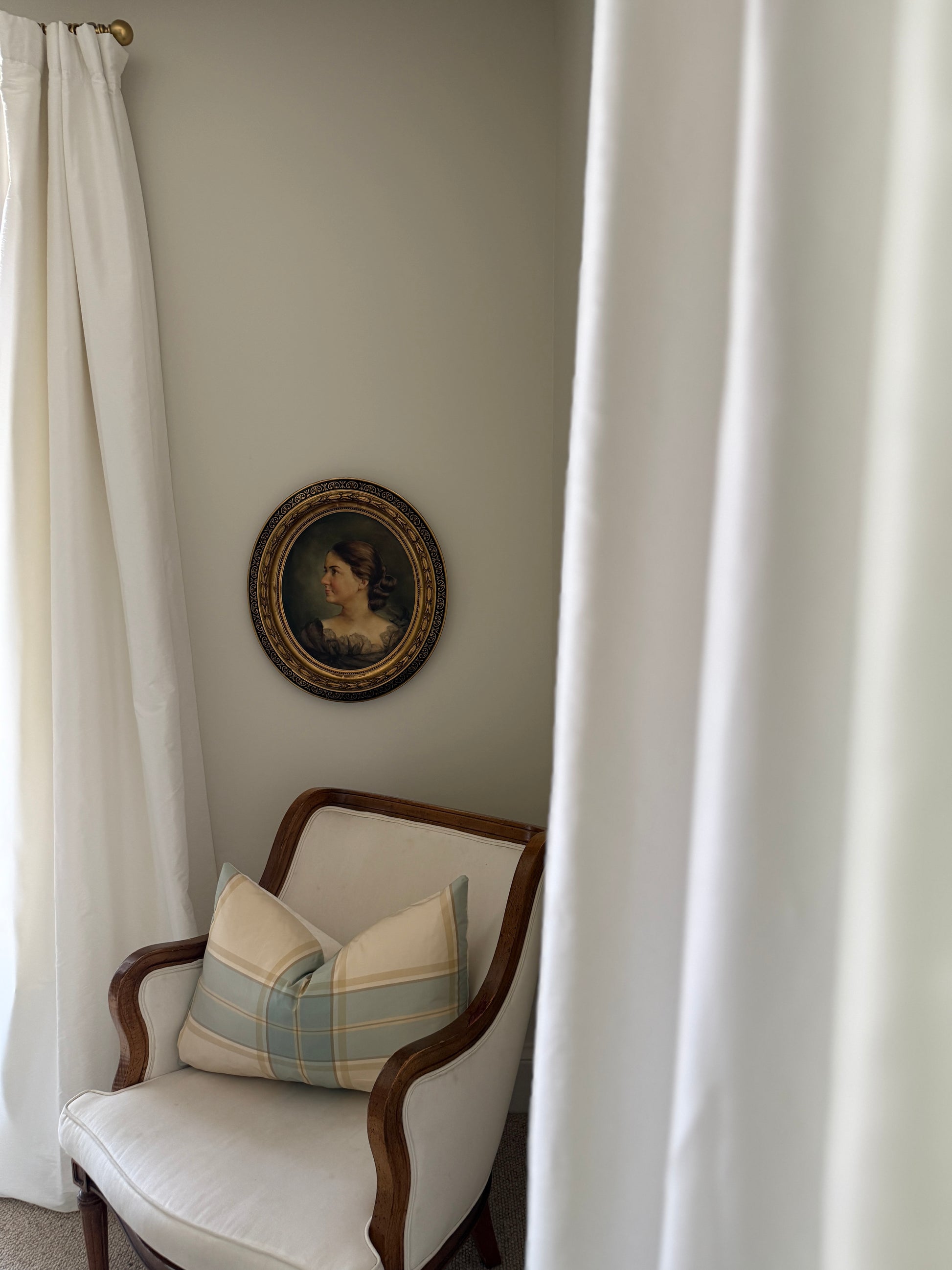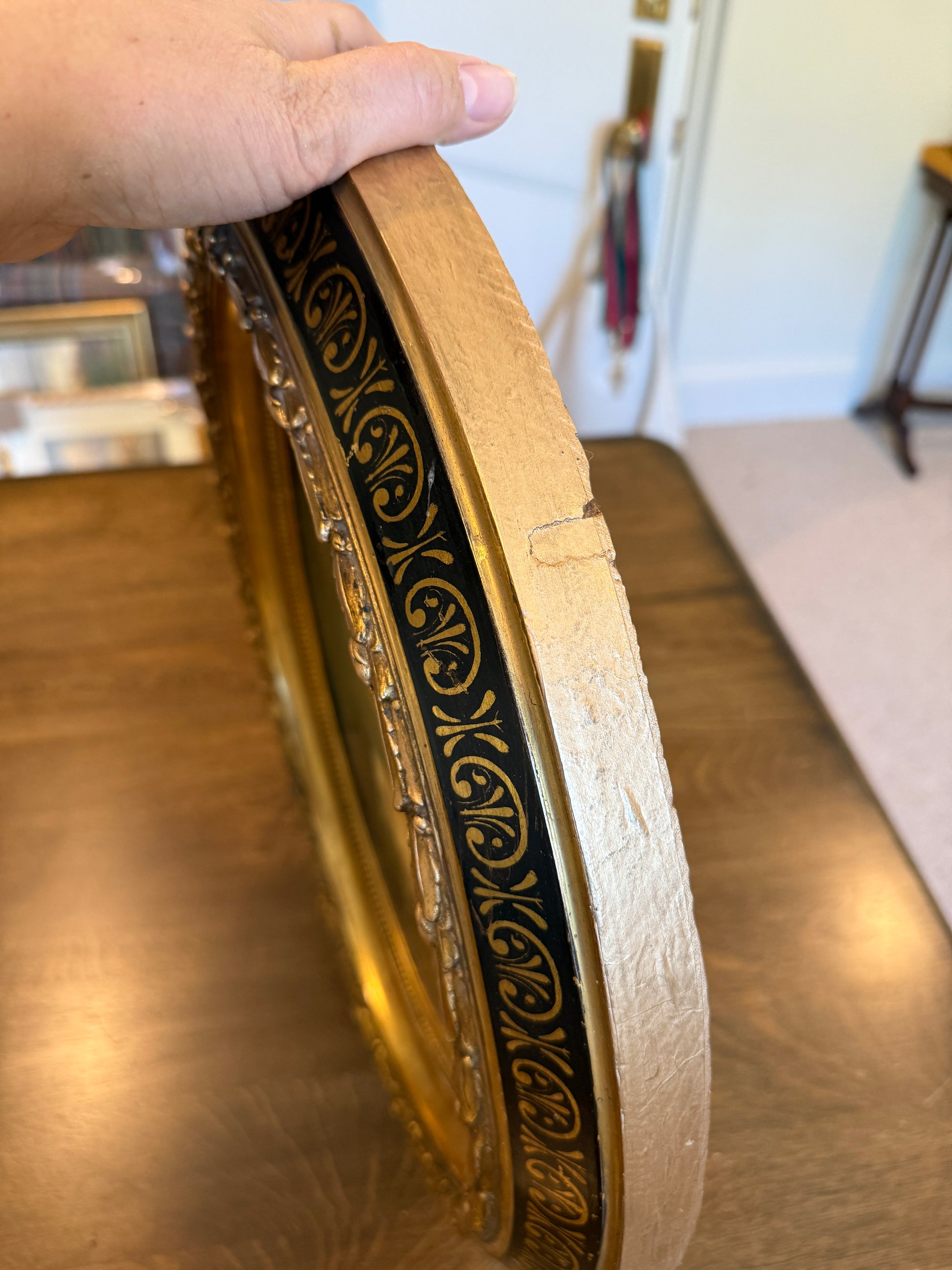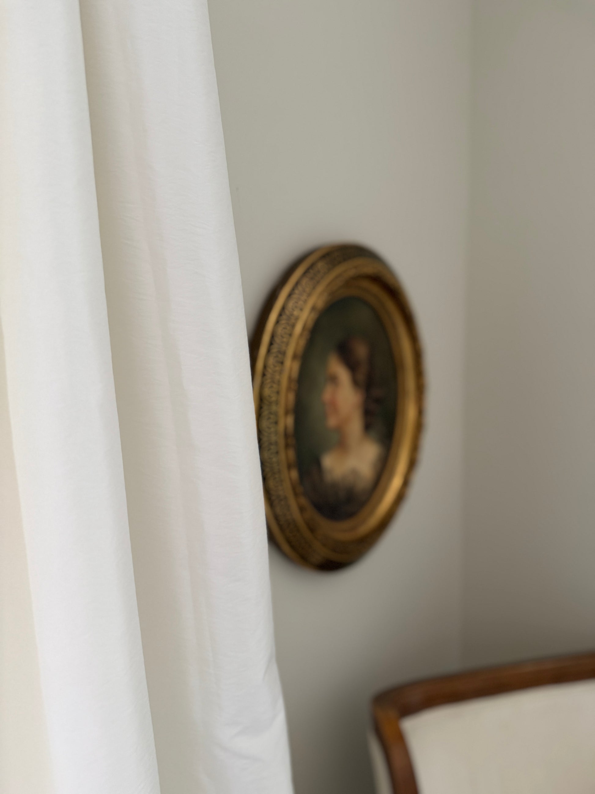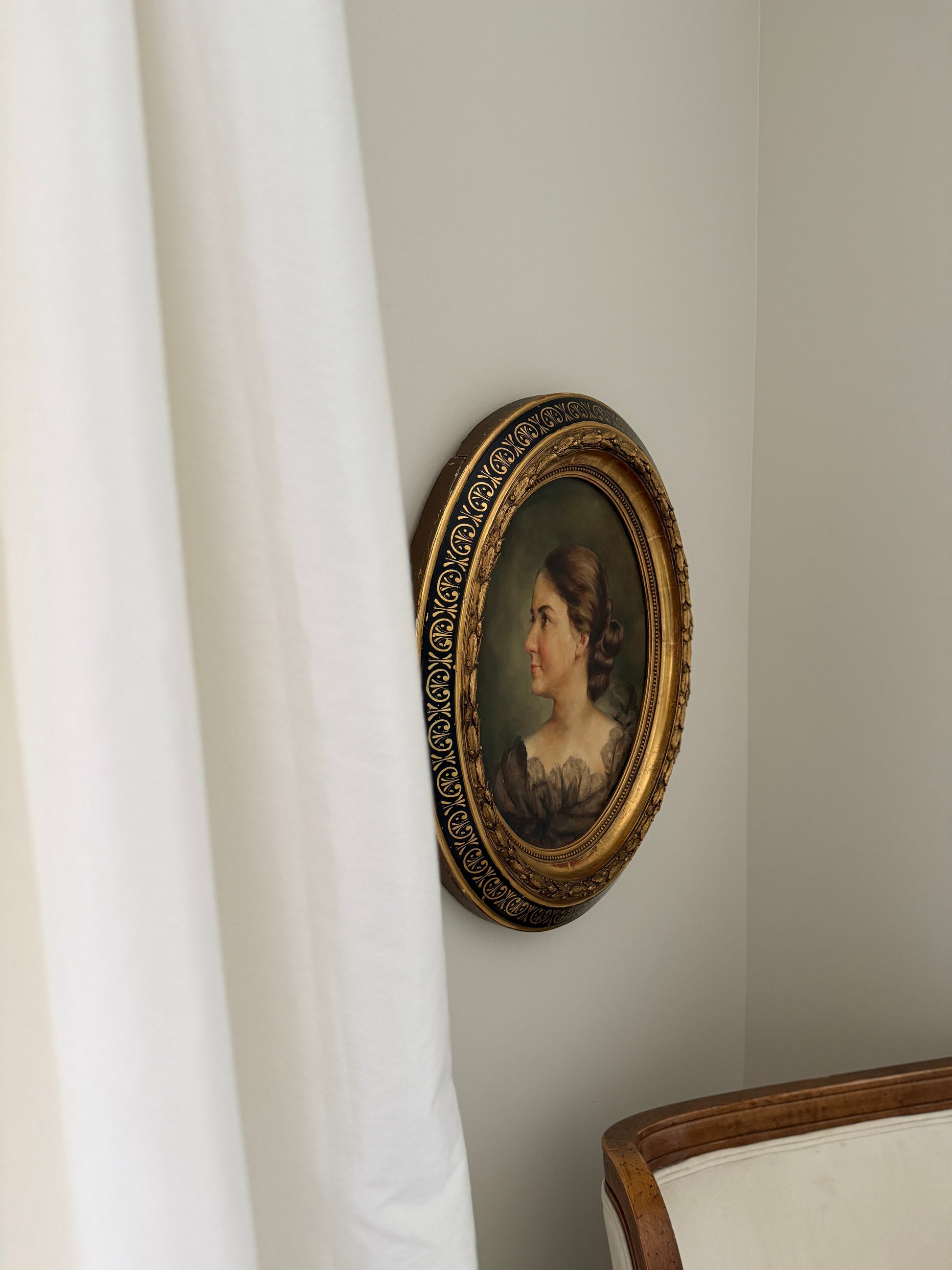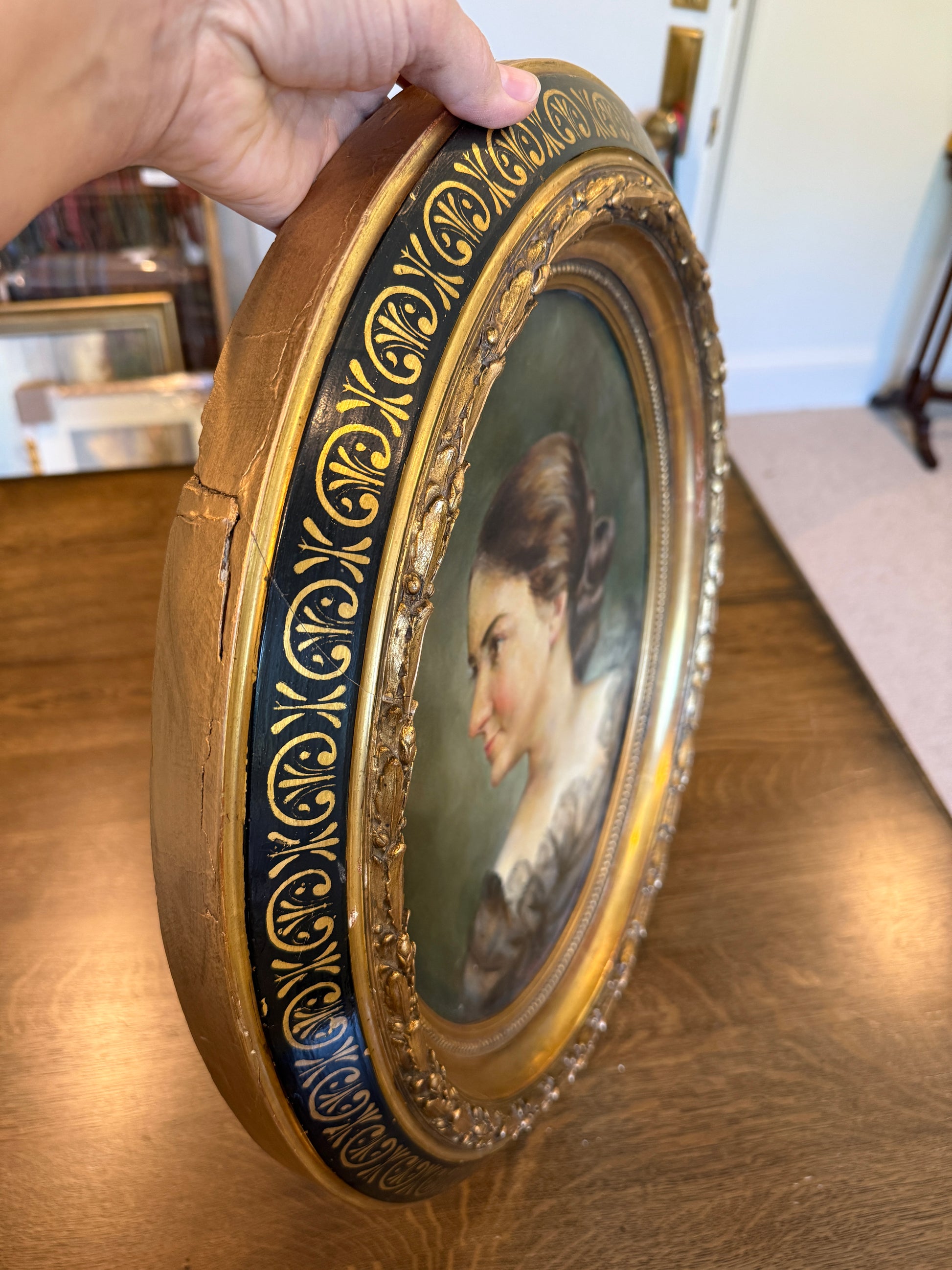 Beautiful oil portrait, original painting. Framed in hand painted, 22k gallery custom wood oval frame. Frame is in vintage condition with some slight crack to the sides, nothing structural and hard to see from any angle. The painting has a slight bubble top right corner. See images.