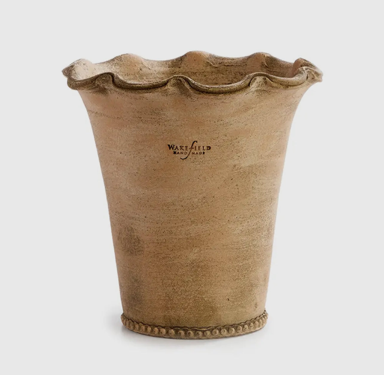 Designed by the master potter Peter Wakefield, one of an exclusive set and handmade in Honduras. With a ruffled opening and beaded detail along the bottom, this stunning clay pot has a feminine design. 8.5 x 8.5 x 9. Use as cachepot or plant directly into. Protect fine furniture by lining interior of pot.