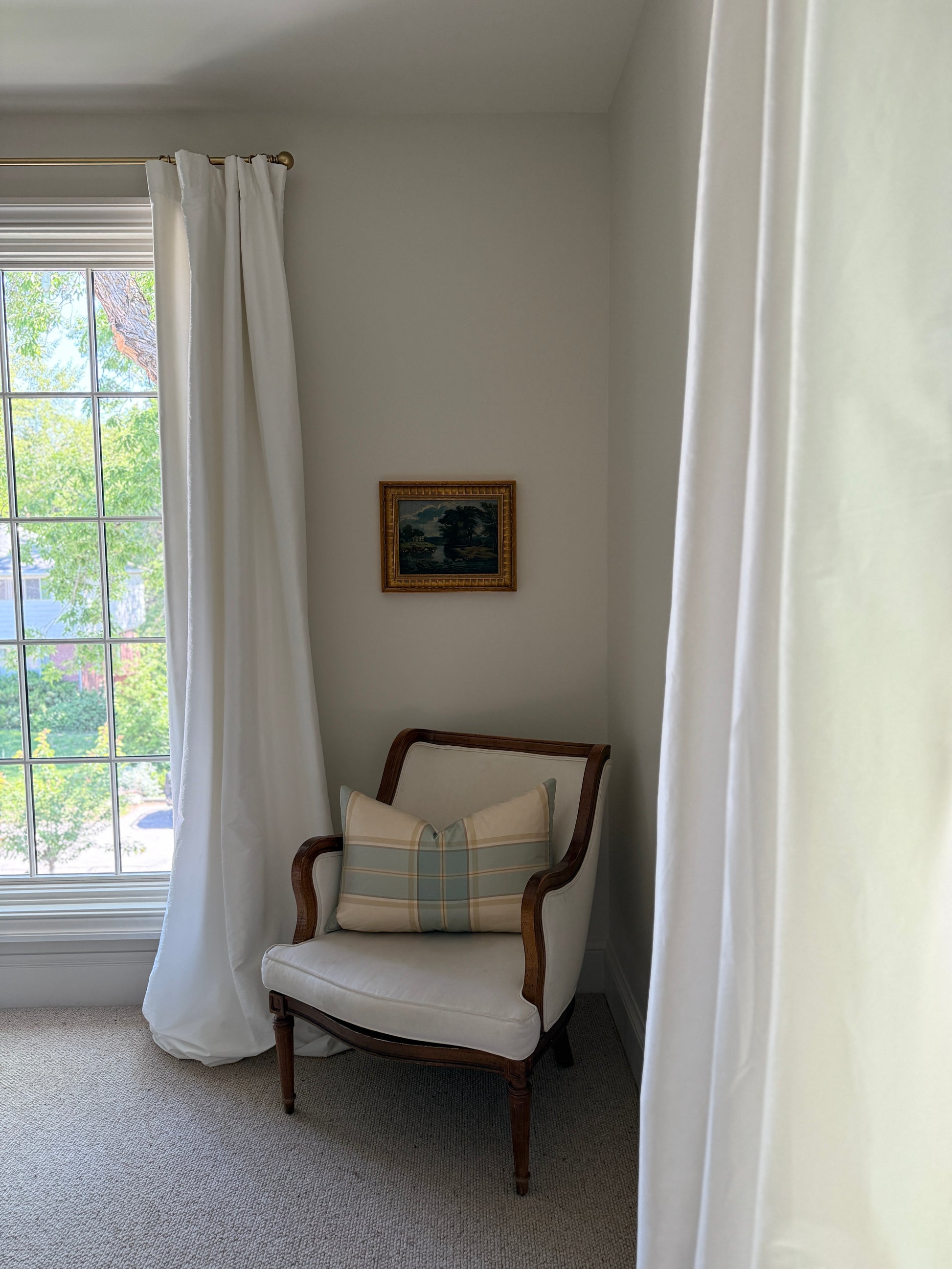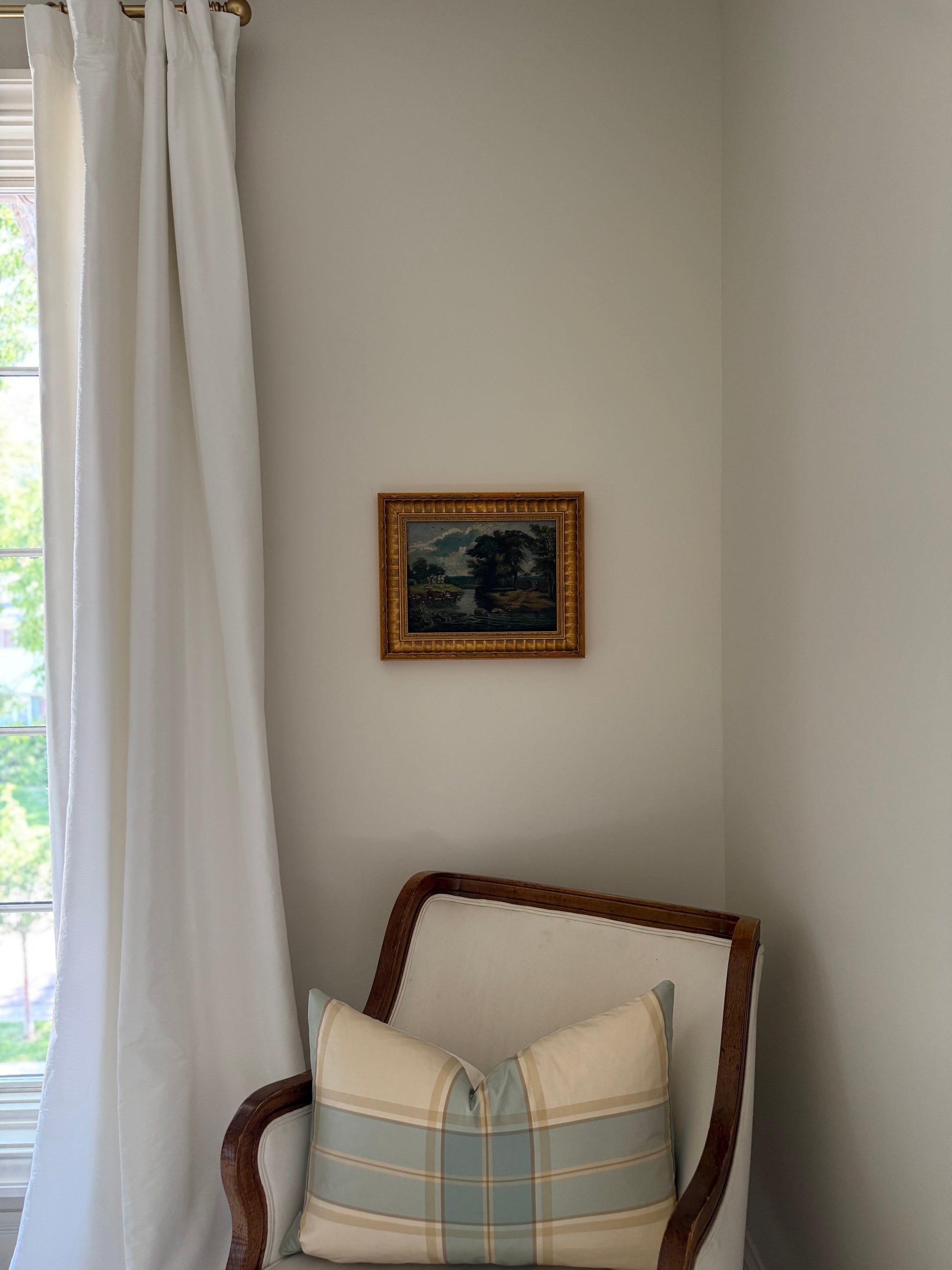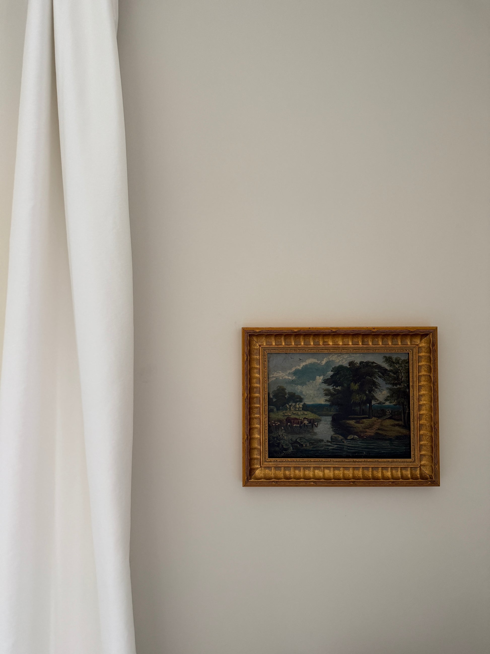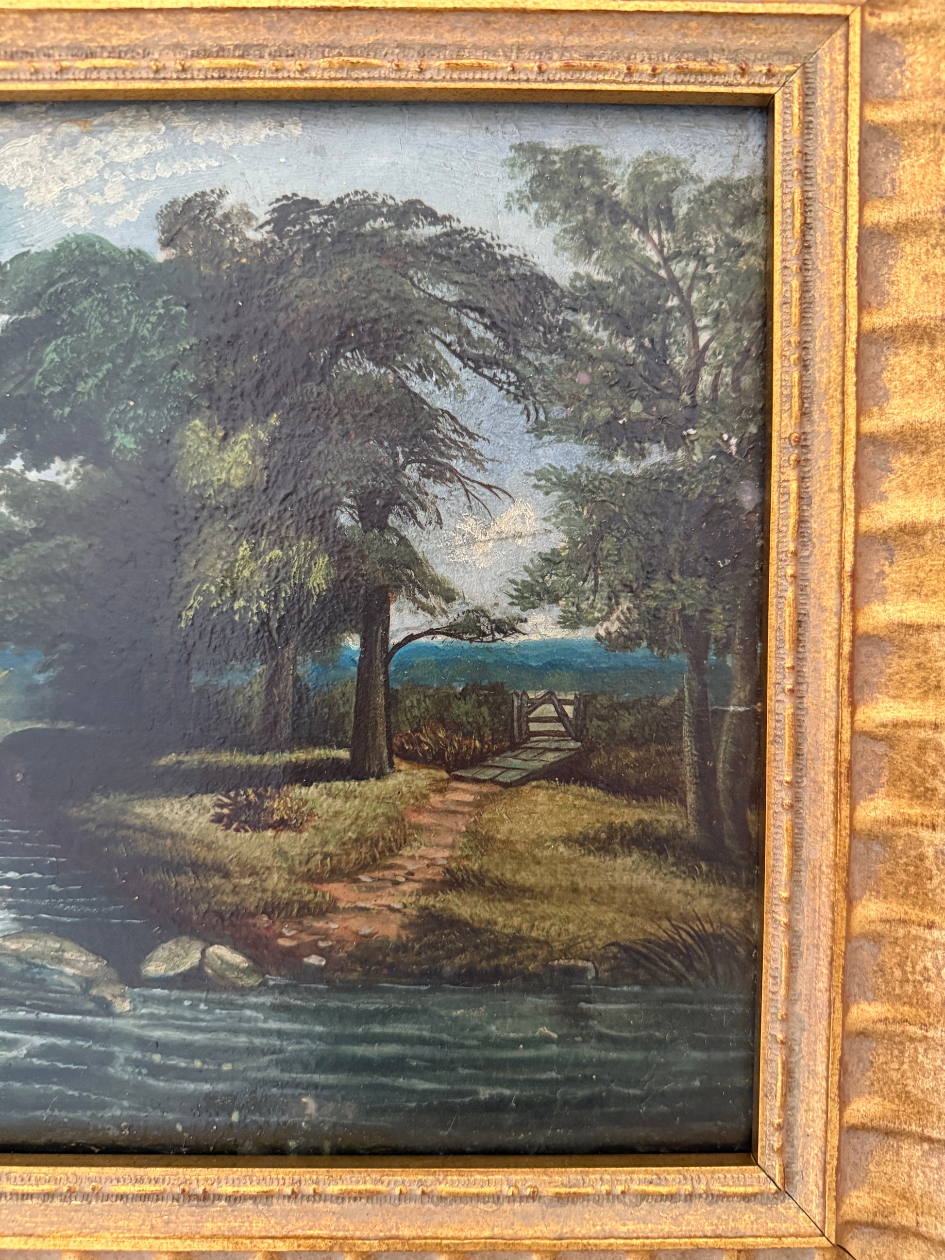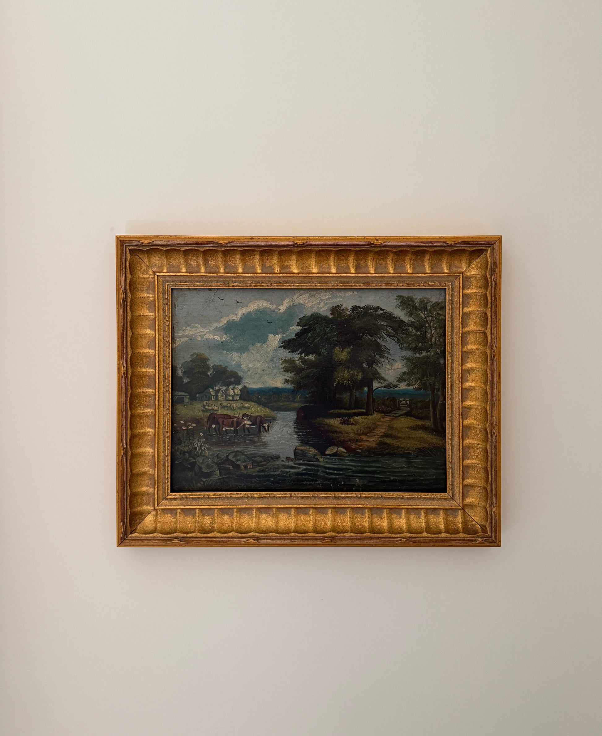 This pastoral landscape painting depicts a serene rural scene with cattle wading in a tranquil pond, framed by trees and distant buildings captured in a naive style. Unsigned. Presented in a classic gold wood fluted frame. On board.